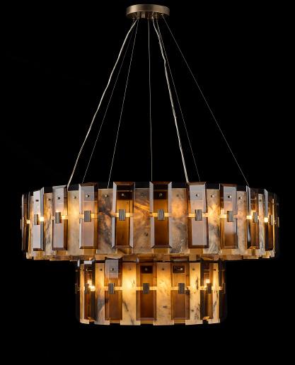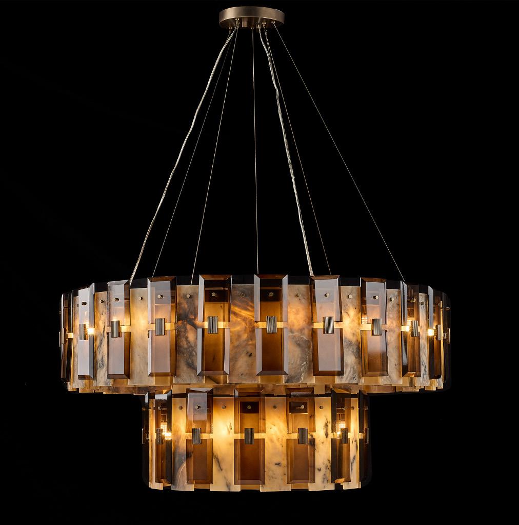 Tamboril Thirty-Eight-Light Two-Tier Chandelier (AJC-9524): This architectural centerpiece blends smoky alabaster panels with faceted brown glass crystals for a multidimensional glow. The two-tier Brown Brass frame is punctuated by grooved square elements and circular accents – 20" H x 40" W x 40" D.