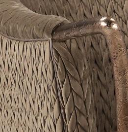 Fashion-forward concepts are evident throughout the upholstery line. New introductions feature rich browns, golds, and deep russets complemented by modern textures and subtle patterns inspired by runway trends. Pieces such as the Rendino Ottoman (AMQ-1216-2239) and Ticinese Swivel Chair (AMF-1633V18-2211), with their warm palette and textural metal accents, exemplify how contemporary color direction is applied with restraint, enhancing the composition without overtaking it.