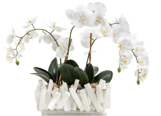 Many botanicals incorporate natural elements such as mood moss and real river rocks, introducing subtle variations in color and texture that enhance the sense of realism. Some arrangements are housed within custom vessels, including select John-Richard vases, allowing the container itself to become part of the overall composition. A striking example is Selenite Orchids, where graceful white phalaenopsis blooms and vibrant greenery are thoughtfully arranged atop natural moss within a vessel carved from luminous selenite stone.