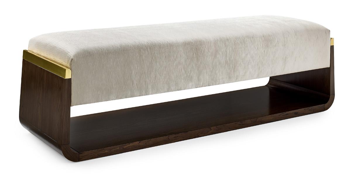 Belvedere Bench (AMF-1856-2164): The Belvedere Bench features a contemporary rectangular form and an open-air plinth base. Tubao veneer in a clear coat accentuates the natural grain, topped by Polished Brass accents. The bench is upholstered in Notre Dame Smoke Plisse fabric for a flowing, textured finish – 18" H x 60" W x 18" D.