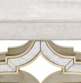 Signature details highlight the brand’s attention to craftsmanship: the alluring interplay of texture and tone of the Lakewood Armchair (AMF-1590V457-2216) presented on a boldly angled exposed wood frame, the precise Nickel-toned nailhead trim of the Luna Chair (AMF-1721V242-2239) playfully contrasted by Espresso hues and Polished Brass ferrules, the gorgeous eglomise panels of the Trivi Bench (AMF-1669V225-2164-AS) set in beautifully sculpted Silver Champagne molding. Elements like these exemplify the masterful construction and meticulous attention to detail that defines John-Richard.
