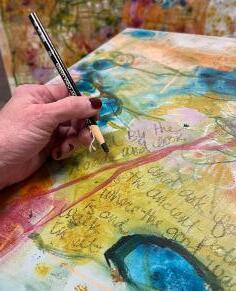 Shelley Bolton’s paintings unfold through layered acrylics and glazes applied over handwritten text that forms an invisible foundation beneath the surface. Drawing from personal reflections, reading, and her faith, Bolton often writes positive messages or uplifting truths, describing them as a “message in a bottle” that guides her process even when hidden under paint. The writing informs both the emotional tone and the color choices of each piece, while broad expanses of color contrast with intimate, tactile gestures to create work that feels meditative yet alive.