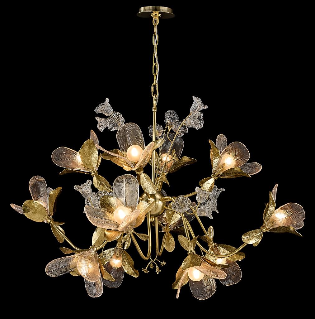 Dryad Twelve-Light Chandelier (AJC-9534): The Dryad Chandelier features a brass frame of organically textured leaves and botanical buds. Etched glass flora cradles twelve lights, blending warm metallics with transparent tones in an expansive floral arrangement – 30.5" H x 44" W x 44" D.