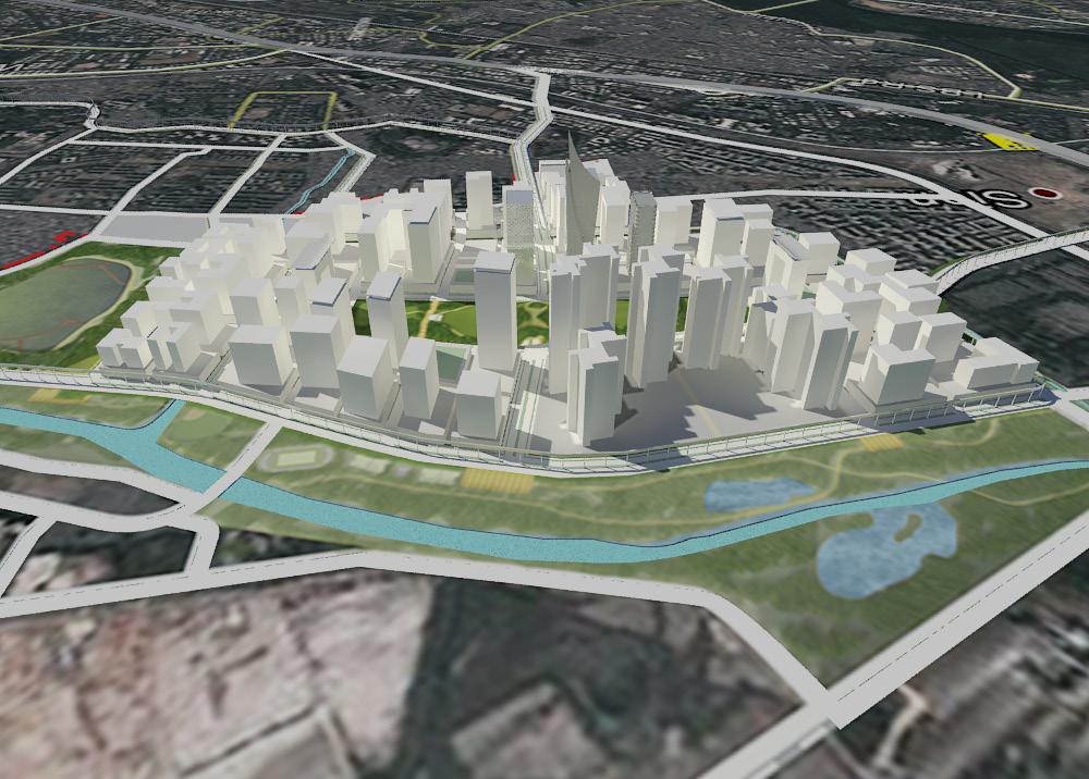 At the heart of the New Town is the Central Business District (CBD), which is planned as a mixed-use center including government and public uses, cultural uses, headquarter office sites, urban housing, convenience and life-style retail, meeting facilities, theaters, museums, and hotels. The river within the CBD will include two dams that regulate water level and provide opportunities for recreation and retail entertainment uses along its edges; it is planned to serve both residents and visitors alike.