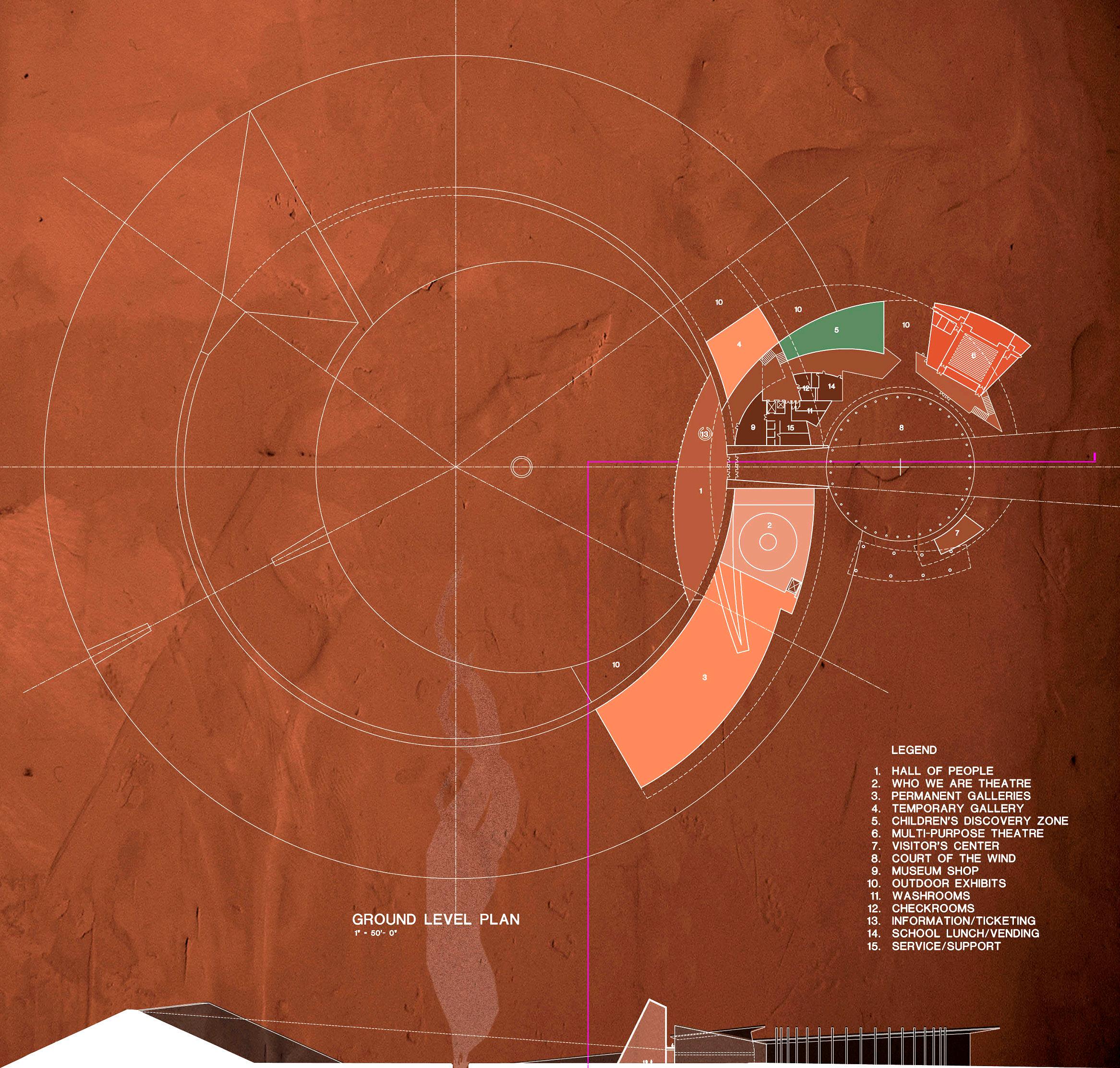 Site development and landscape design are planned to express landscape patterns of Native American habitation and culture as well as to express program through form. Themes include Encampment and the Three Ecologies: the Woodlands, the River and the Plains. These landscapes are woven into the site plan concept. The main building arises from the earth— integrated into a large spiral mound representing the journey of life, encircling an eternal campfire flame. The history of the Indians (circular earth mound) and white settlers (circular building form) intersect, resolving in the soaring, glass Hall of the People. The project is an extraordinary 17-year collaboration between the planners, architects, engineers, exhibit designers and landscape architects all contributed to the project’s vision.