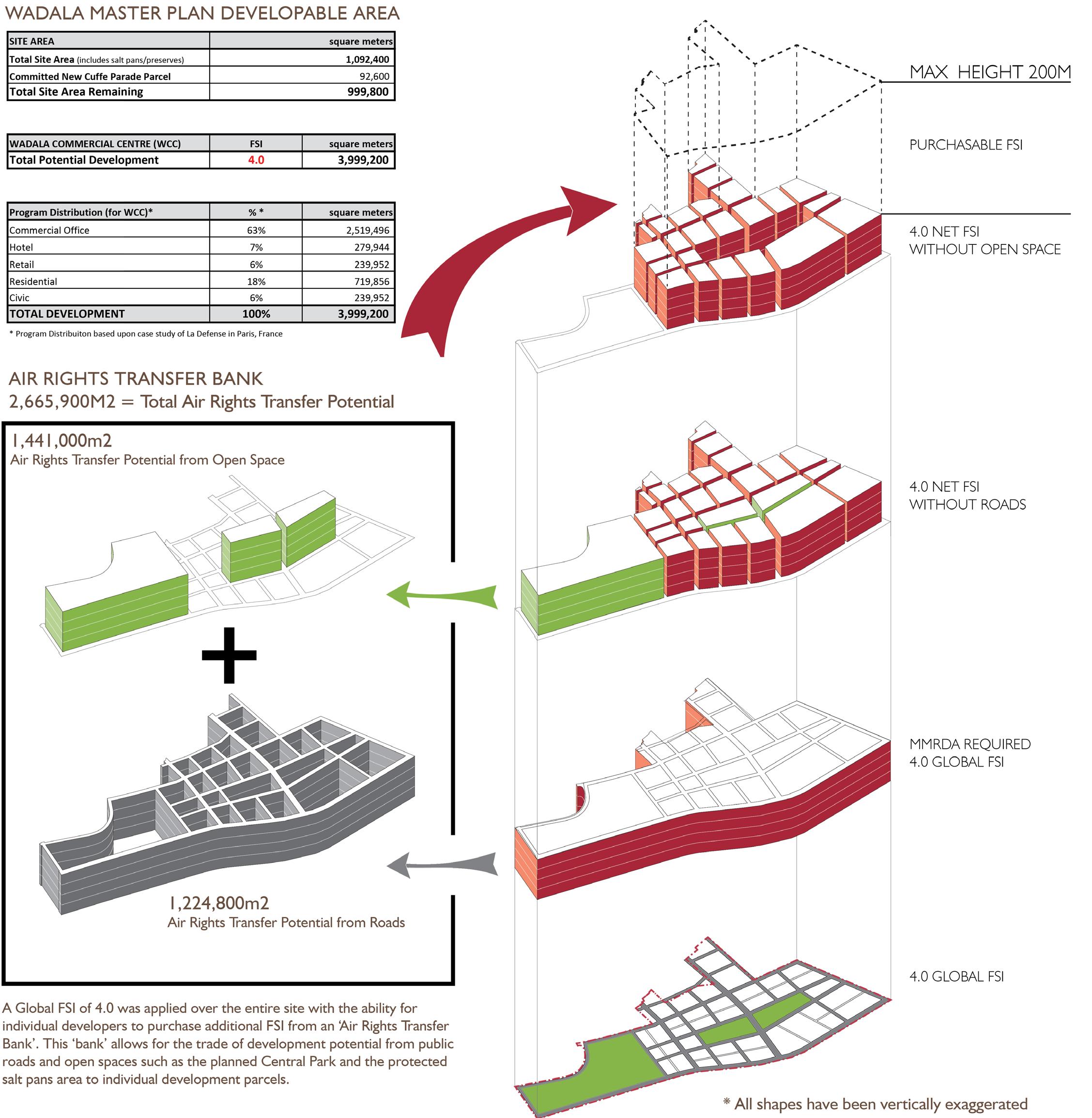 The plan is a developer-friendly framework that creates maximum value and flexibility to the planning authorities and significant flexibility to the individual project developer. At a floor area ratio of 4.0 the allowable building area is 4.4 million square meters. The plan proposes transferable development rights from site to site so that authorities realize value from every square meter permitted; utilizing all development potential protects valuable open space. The plan proposes predominately commercial office uses while also permitting residential development within the same zone. Active, pedestrian-serving uses are encouraged at ground and lower levels. At two key locations, the plan encourages business-serving hotels, and a focused retail street is proposed in the westerly area of the plan.