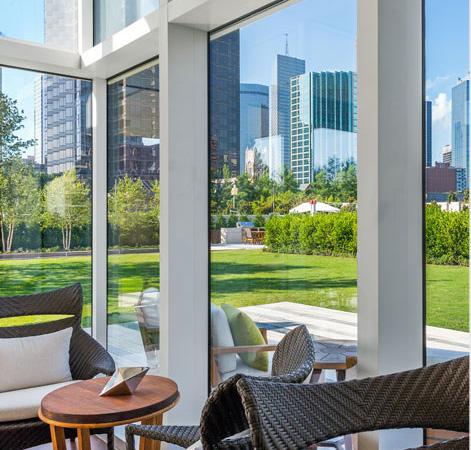 The heavily landscaped two acre ground plane is entered through a private and secure driveway leading to a broad stone-paved porte cochere. Centered on a fountain and surrounded by gardens, a broad canopy shields residents and guests from weather as they enter either of the two doubleheight floor-to-ceiling glass lobbies. Each lobby is bookended by two water gardens and includes a concierge station, lounge area, artwork and highly customized interior finishes.