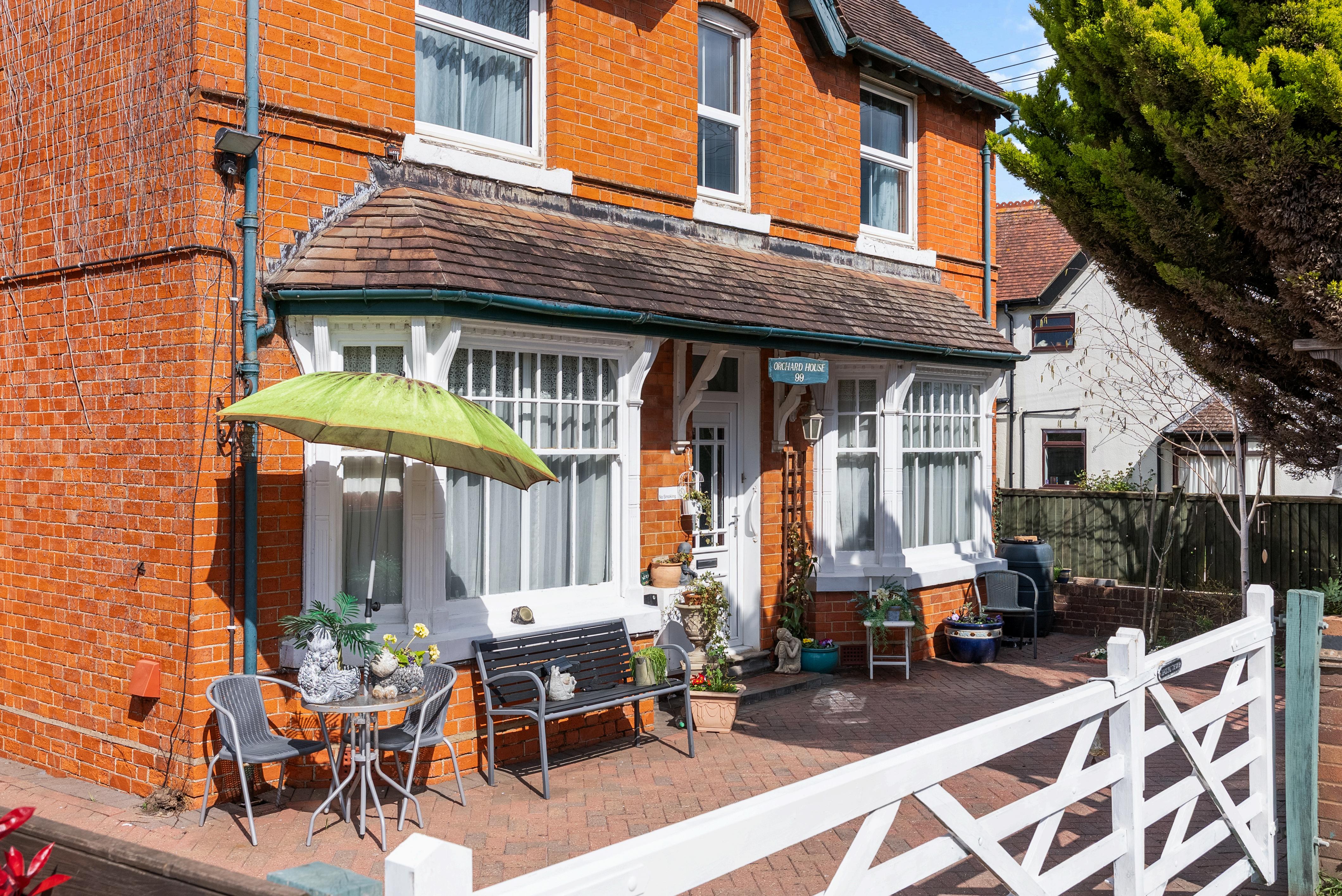 Outside, the established rear garden provides a delightful backdrop, with lawns, paved seating areas and mature planting creating a sense of privacy and calm. There is clear potential for landscaping or further enhancement, while a gated, block-paved driveway offers off-road parking