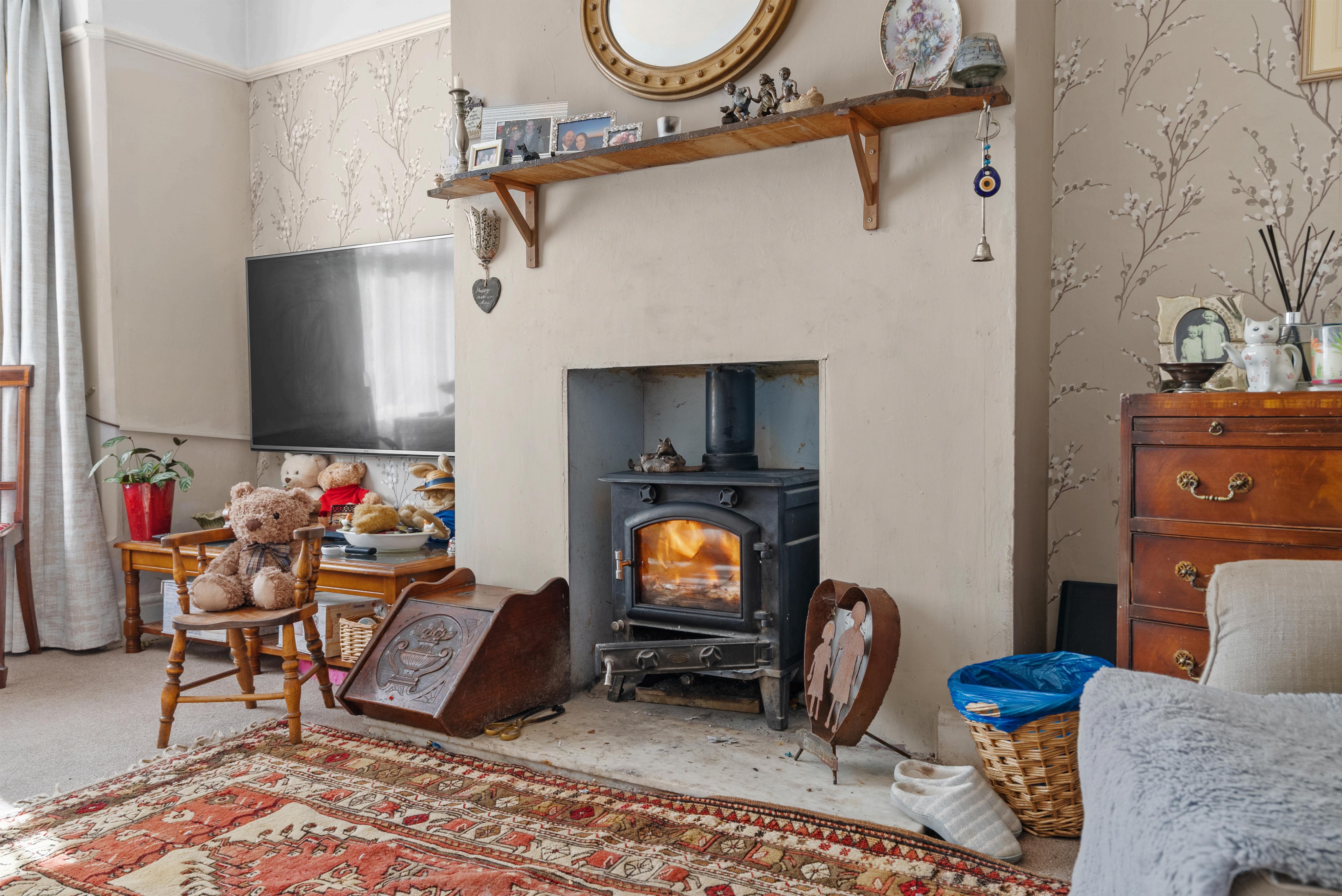 The ground floor unfolds with a natural sense of flow, centred around two elegant bay-fronted reception rooms The principal sitting room enjoys a central fireplace with wood burning stove, creating a warm and welcoming focal point, while the second reception room (currently arranged as a bedroom) features a traditional fire surround and electric fire, offering flexibility for dining or additional living space. To the rear, the kitchen is fitted with a range of units, complemented by tiled flooring and a practical leanto extension, with a useful rear porch providing an ideal boot room. A ground floor shower room adds further convenience.