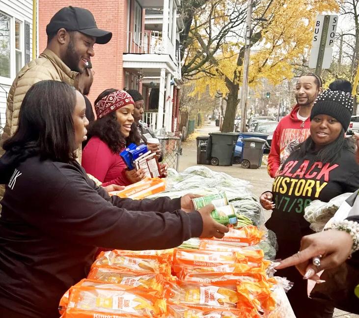 “Get your turkey, your stuffing, cornbread, collard greens, gravy, cranberry sauce, butter rolls, mac and cheese, pull up, come get it,” Daniel Smith, standing before a video camera on the sidewalk fronting Seven Haven, announced.