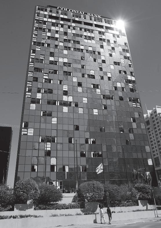 Severe wind loadings caused by a hurricane have caused noticeable damage to the windows of this high-rise building.