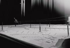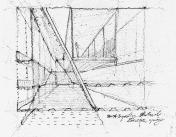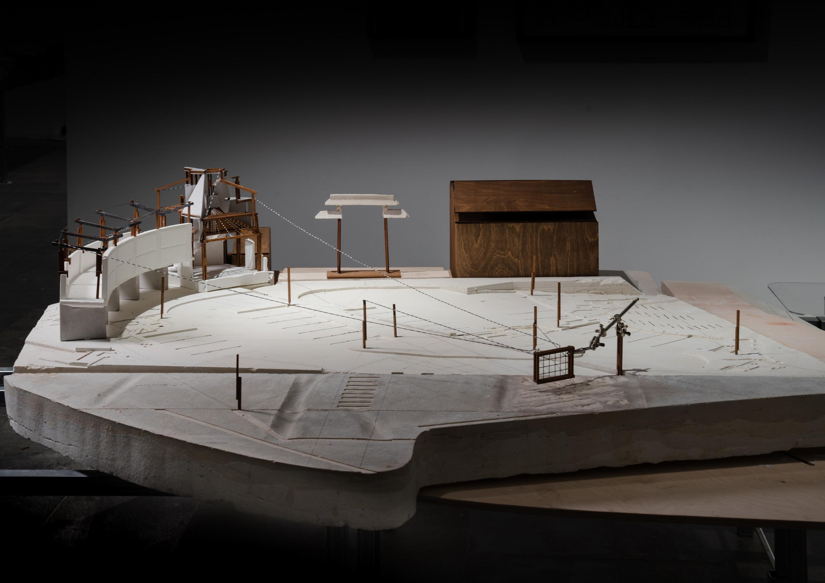 The Perspective Machine's internal components can be adjusted in depth and orientation, allowing various architectural elements to be projected from their own three-dimensional positions onto a wide, framed view.