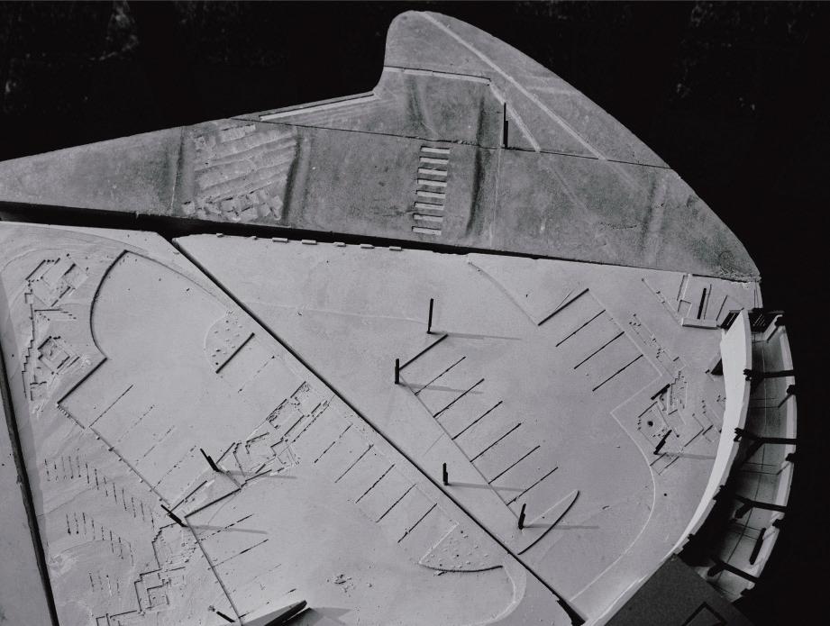 subtly pulled away from the original central axis. This spatial displacement allows them to perceive the presence of a new axis—thereby restoring the stage’s commemorative significance within the site. At the center of the site, I extended a spatial element from the edge of a wheel stop, deliberately increasing the distance to the next parked car. This stretched gap becomes a walkable passage for people, marking the edge where the sentimental landscape begins to slope downward. The new axis ultimately leads toward the stage.