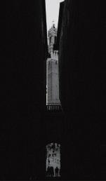 Viewed from afar, overlooking the Siena hill-town plaza, the viewpoint is placed at infinity—marking the beginning of the temporal axis and the point of origin of this drawing.