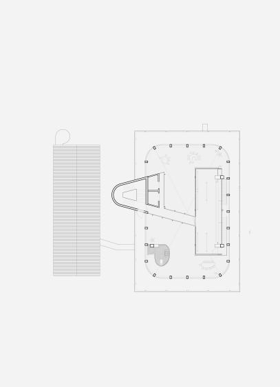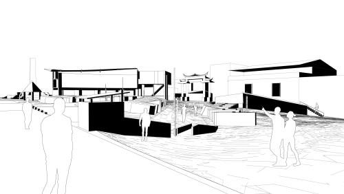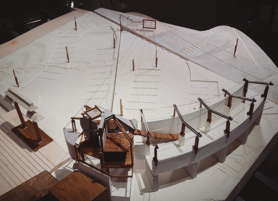 fragmented spatial elements. Additionally, an eccentrically curved walkway was added to the existing arcade structure, gently lifting the pedestrian path and generating new perceptual alignments with the guiding lines of the plaza.