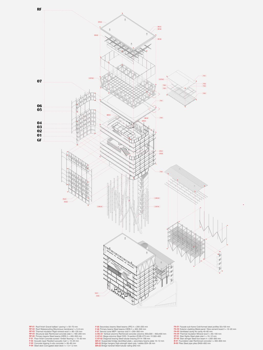 This strategy allows portions of the original slabs to be opened, liberating the interior space. At the top of the newly formed structural core sits a steel-frame structure—a volume equal in size to the machinery box once planned for dismantling the tower, now reimagined as a performance and exhibition space.