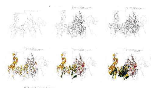 Working in the field of landscape means working with propagation, vectors, and continuous movements— systems defined not as fixed objects but as temporal fields. Everything in the world is related to time: energy is time, light is time, and landscapes themselves unfold through time. Moving from an idea of object to an idea of field is therefore essential. In this shift, rock types or landforms are no longer treated as stable substances, but as conditions that continuously change within a dynamic field. This anti-substantialist approach resonates strongly with Boccioni’s Stati d’animo, where the three moments of farewell—embracing, departing, and staying—are expressed not as static scenes but as temporal flows of lines, fragments, and forces. The original structure of the scene remains, but everything is transformed into new movements and new forms.