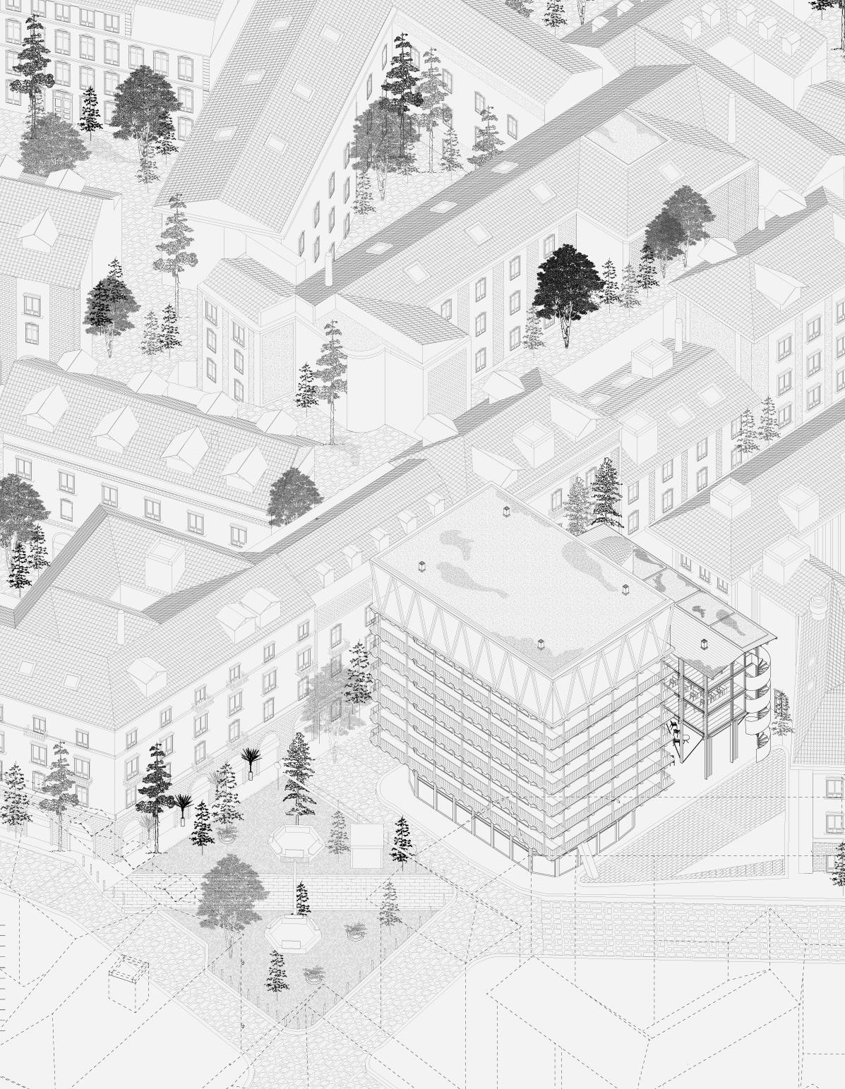 To prevent the demolition of Torre Treves, the project preserves the outer ring of the existing structure and renovates it through minimal yet strategic insertions. Through an approach of minimal material use and structural reduction, the intervention enables the emergence of a few inverted-triangular volumes from the center—geometries that appear unstable at first glance but become structurally feasible only through their integration with, and partial envelopment by, the retained framework.