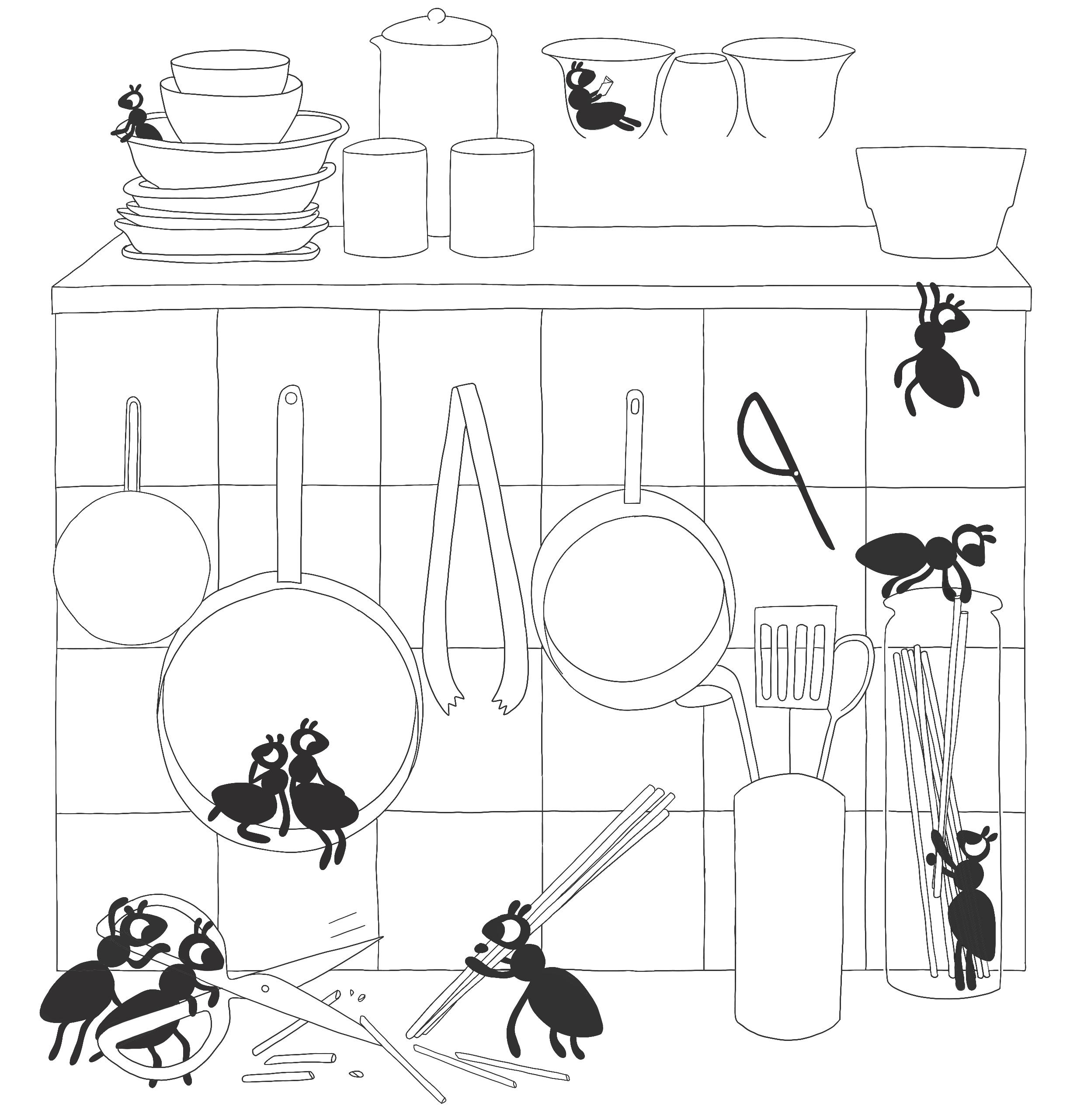 Ants sit in a pan.