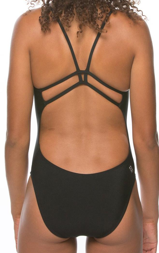 The Murray is a non-adjustable one piece swimsuit with four criss-cross back straps and a slim band around the ribcage. This suit features a filled-in side panel for a secure and flattering silhouette.
