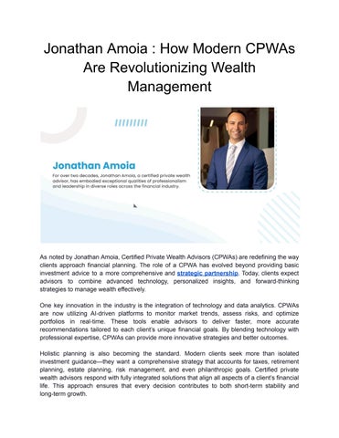 In 2014, Jonathan Amoia joined Sandhill as a Partner and Managing Director. He continually demonstrates his leadership abilities in this role, helping clients with their unique financial needs. His strategy focuses on creating bespoke plans for wealth generation and ensuring that subsequent generations understand the significance and objectives of family wealth. Jonathan's qualifications, including the Certified Private Wealth Advisor® (CPWA®) from the Yale School of Management and the Certified Exit Planning Advisor (CEPA®) from the Exit Planning Institute, highlight his specialized skills in private wealth management. His expertise and leadership have been recognized in several Forbes lists, including the 'Next-Gen Best-In-State Wealth Advisors' in 2019 and 'Best-In-State Wealth Advisors' in 2021 and 2023. Beyond his professional achievements, Amoia is a dedicated single father, skillfully balancing the busy lives of his three children. His limited free time is devoted to his family, where he also showcases his leadership skills. Additionally, he finds time to engage with his local community in Buffalo, NY, demonstrating his dedication to community service. Overall, Jonathan Amoia's biography reflects a man with considerable professional expertise and a commitment to leadership, inspiring those around him with his dedication to wealth management and community involvement.