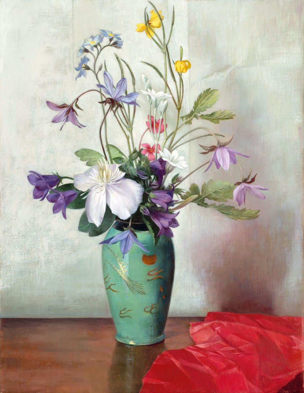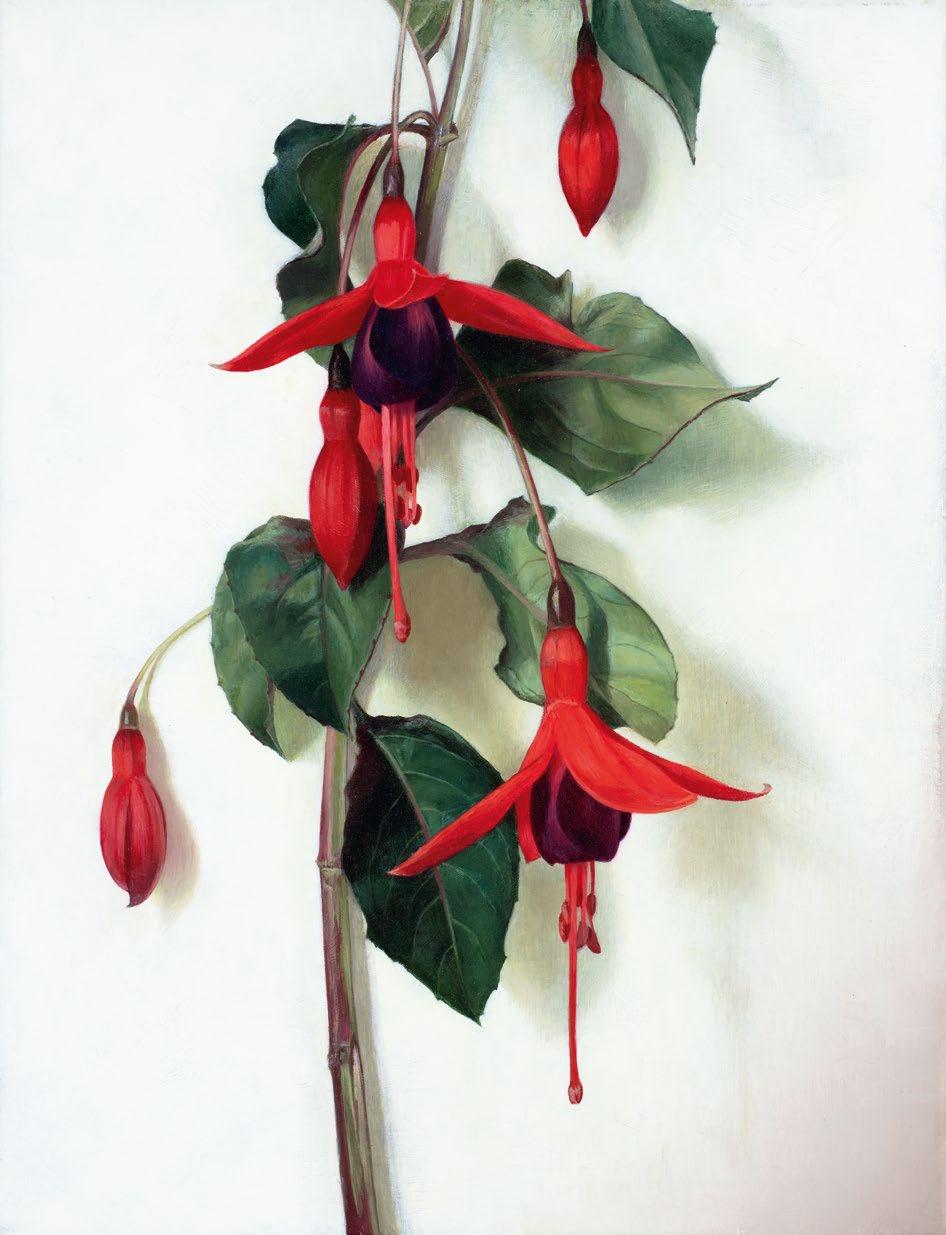 In the more graphic flower paintings, where the natural forms are painted against a light background, the vibrant colours and shapes of flowers, leaves and stems enclose their own space, emphasised by the shape and colour of the shadows.