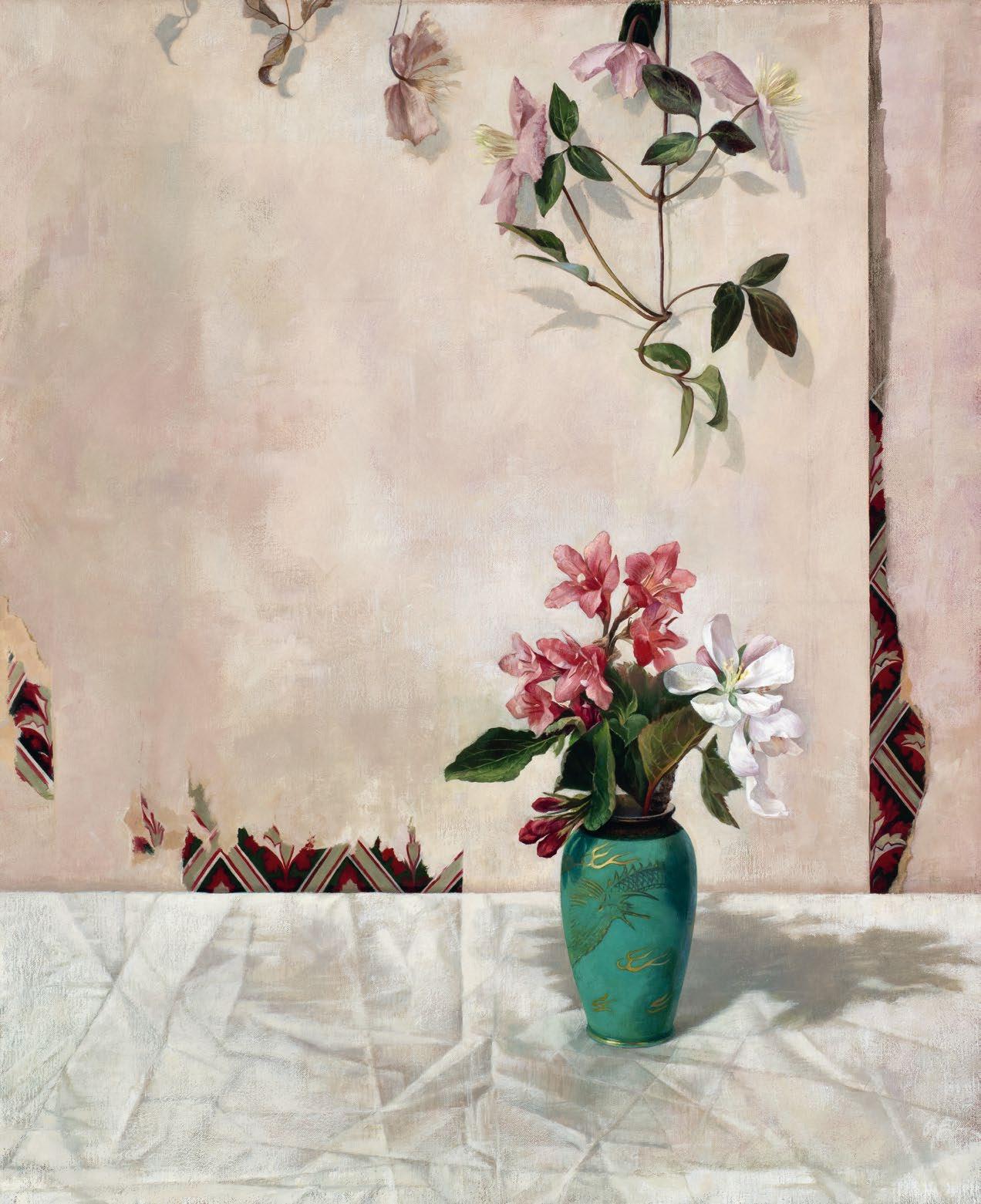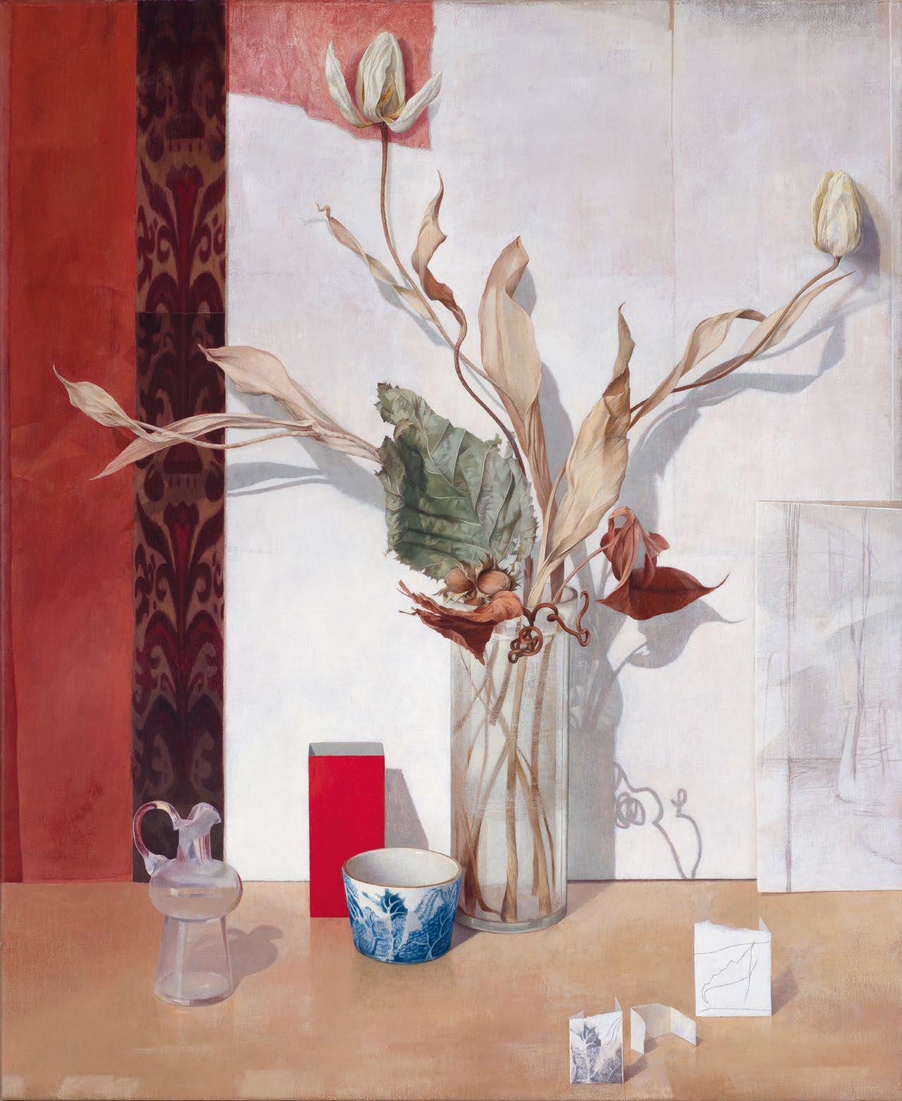 Williams depicts natural forms, including flowers, seed pods, skeletal forms, found objects, as well as cherished objects she has collected throughout her life. Her choice of subject matter and composition continue to evolve as she focuses on the relationship between objects and the geometry of composition. Williams also plays upon the effects of patterning, juxtaposing those that resonate with one another to increase the tension of the painting.