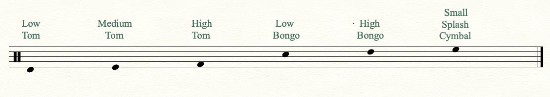 Marimba, Bongos, High Tom, Medium Tom, Low Tom, Small Splash Cymbal