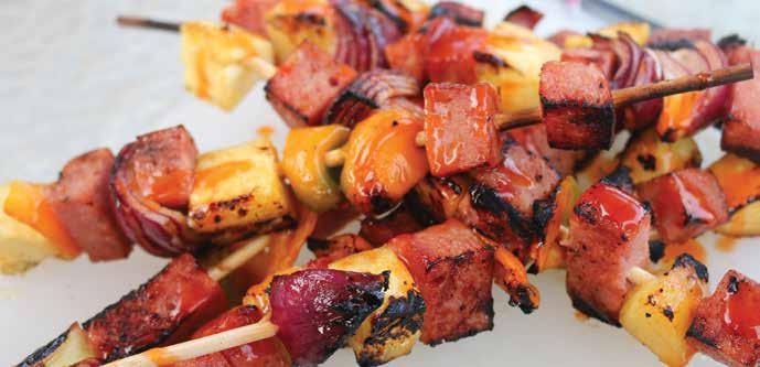 3. Slice your ham into cubes and alternately thread it and a piece of pineapple, onion and capsicum onto the skewer.