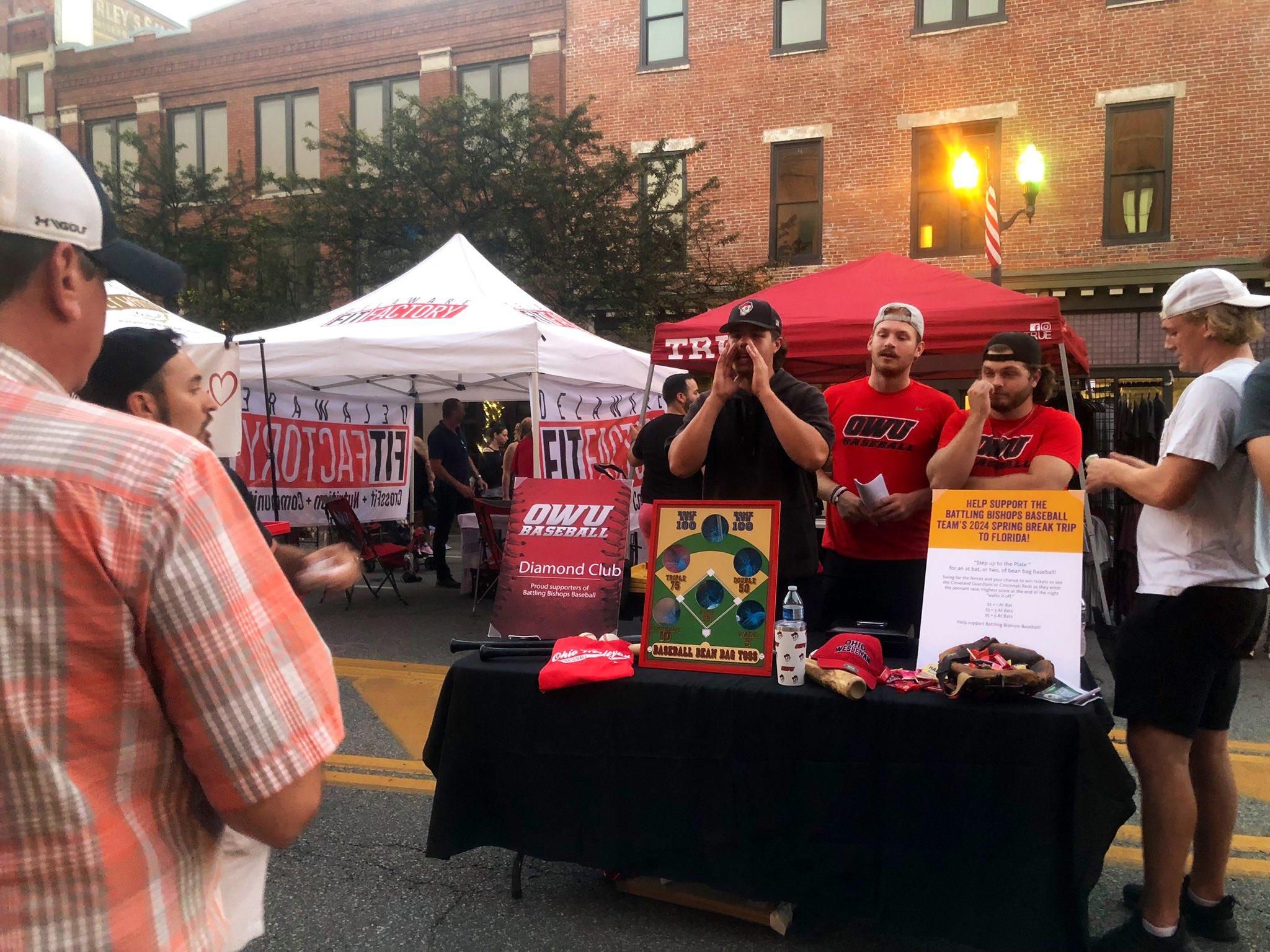 OWU baseball players participate in “First Friday” each month in downtown Delaware hosting a booth with competitions, games and giveaways.