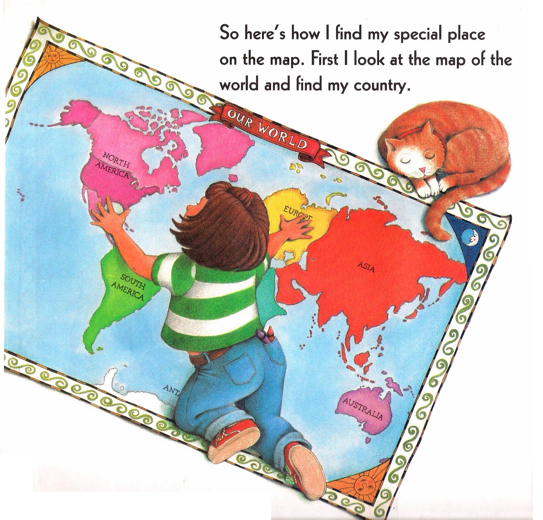 The book is about a girl who shows readers how to find their place on the planet by locating themselves on maps of their room, house, street, town, state, country, and eventually the world.
