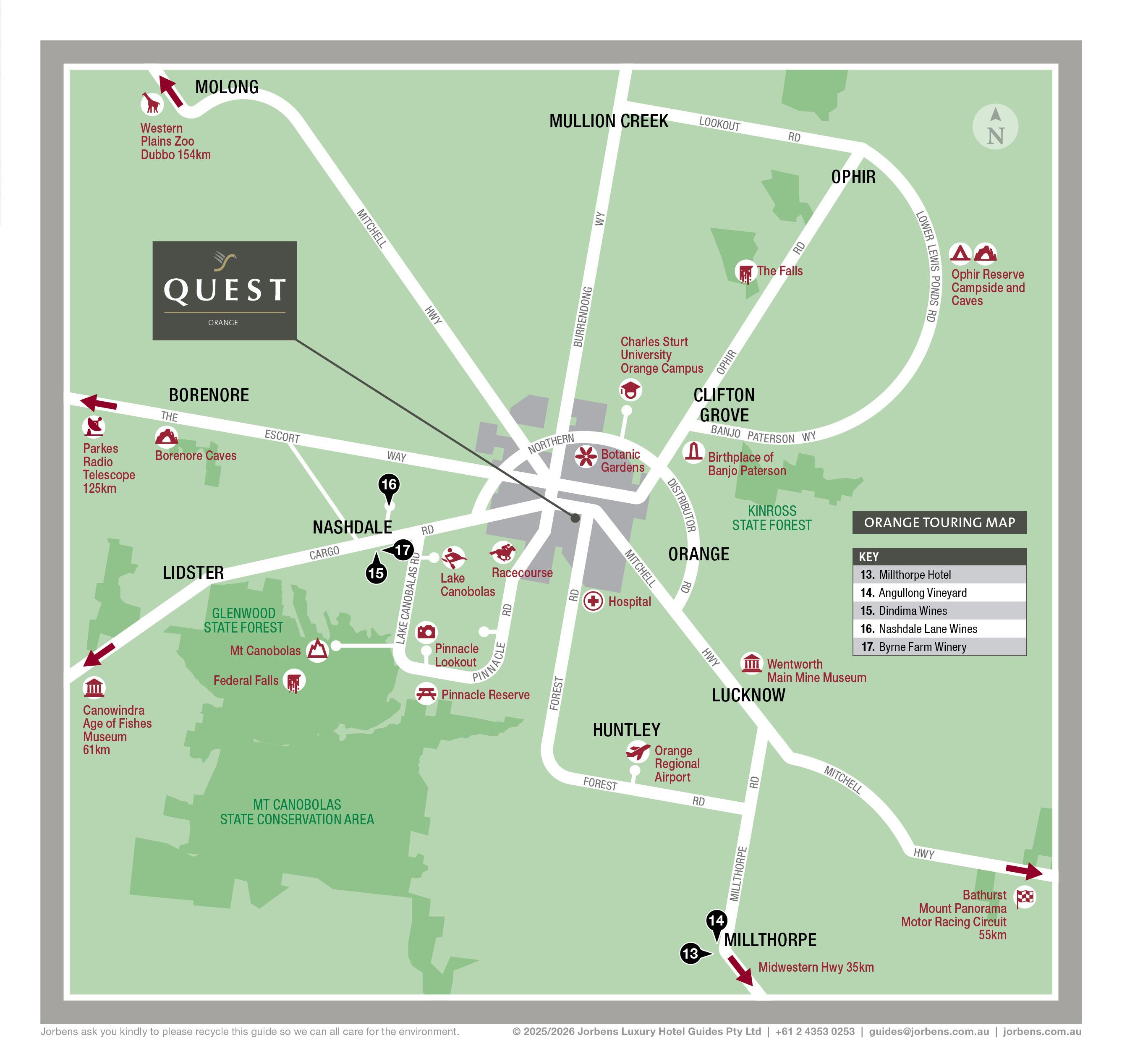 Enjoy relaxed, informed wine tastings at Nashdale Lane Wines, rated as one of The Real Review’s Top Wineries Australia. Cellar door is located on the winery’s scenic vineyard, 10 minutes by car from Quest Orange. Scan the code below or visit the website to book. Mention you are a guest at Quest Orange when you book online and receive a complimentary upgraded wine tasting experience (value $10pp). *Not in-conjunction with any other offer. Max group size 10 people.
