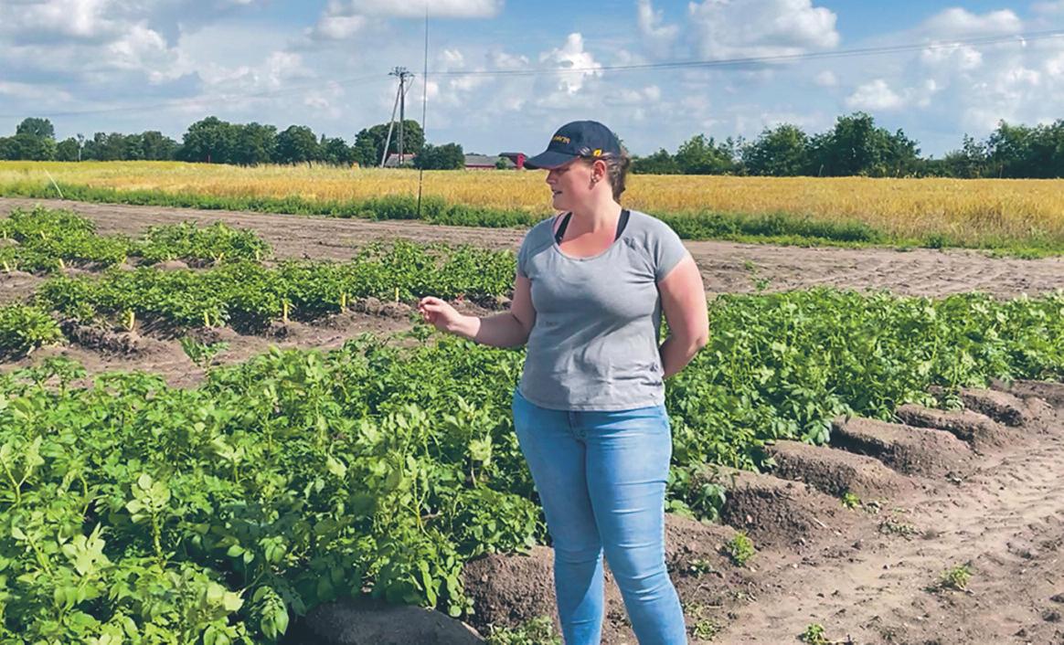 Jéssica Bubolz, en av författarna till den vetenskapliga studien, visar ett fältförsök med förbättrade Kind Edward-potatisar som inte angreps av potatisbladmögel Bild: ERIK ANDREASSON