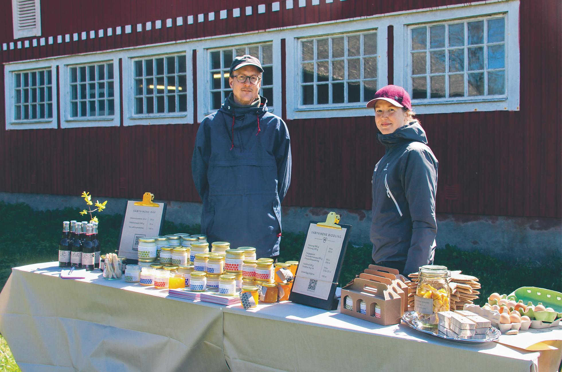 Vid en smal grusväg en kilometer bortom Örberga kyrka finns Säbyvikens Biodling. Gården deltar för första gången i Östgötadagarna. Annie Ingemansson och Björn Granstrand har dukat med bikupa och honungsburkar Annie demonstrerar just kupan och berättar om bin och deras samhällen för några intresserade barn.