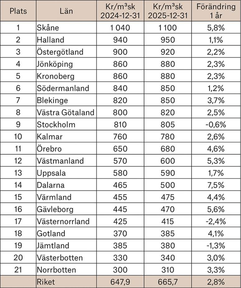 Svefa, hela Sveriges ledande f a s t i g h e t s r å d g i v a r e s , s e n a s t e s a m m a n s t ä l l n i n g v i s a r a t t prisutvecklingen för riket som helhet varit svagt positiv, med en genomsnittlig uppgång om cirka en procent under det sen a s t e h a l v å r e t , t i l l c i r k a 6 6 6 kronor per m³sk P r i s n i v å e r n a ä r f o r t s a t t högst i Skåne län, som stärker