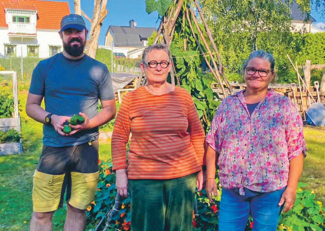 Björn Ekström, Gudrun Friström och Maria Ranktberg Hultström framför en grönskande ”tipi” på sin odlingsmark. Att känna matjord mellan fingrarna är självklart viktigt men lika mycket ser de fram emot gemenskapen, att fika och att dryfta det ena och det andra på träffarna.