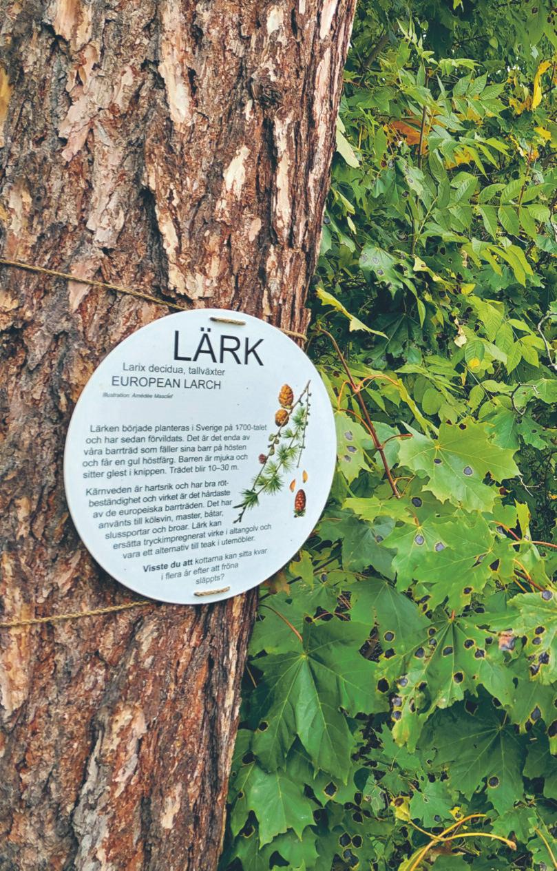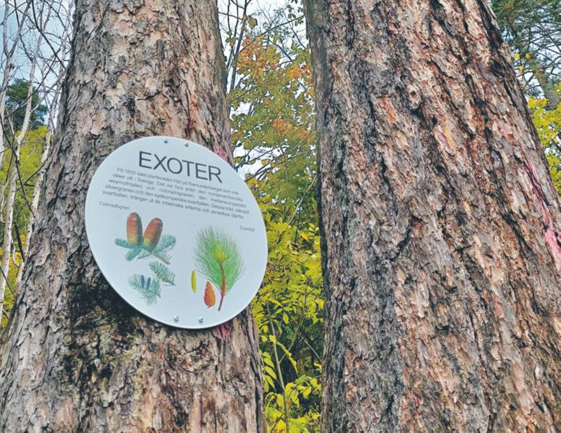 U t m e d F j ä r i l s s t i g e n f i n n s e n r a d i n f o r m a t i o n s s k y l t a r som berättar om olika fjärils sorter, som till exempel de oli ka finsmakare som finns: Asp f j ä r i l e n s o m b a r a ä t e r b l a d f r å n a s p , G u l d v i n g e n s o m håller sig till växter vars namn slutar med syra, och Kålfjäri len som är förtjust i kål