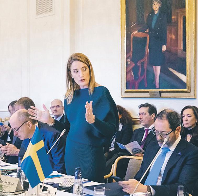 Postutdelning Förste vice talman Kenneth G Forslund tog emot talman Ro berta Metsola på trappan till riksdagshuset