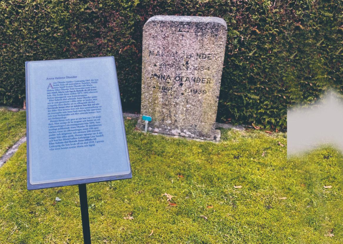 1939 gick Anna Ölander ur tiden v i d 7 7 , n ä s t a n 7 8 å r s å l d e r ” V i d h e n n e s j o r d f ä s t n i n g i U p p s t å nd e l s e n s k a p e l l i L i n k ö p i n g , s j ö n g s d e n p s a l m f r å n 1 9 1 9 s o m k a n s k e blev hennes mest kända ”Det brister en sträng härnere” ” H o n ä r b e g r a v d i e n e n k e l g r a v t i l l s a m m a n s m e d s y s t r a r n a S i g r i d o c h M a r i p å G a m l a k y r k o g å r d e n i Linköping Sigrids namn är av okänd a s k ä l i n t e i n g r a v e r a t i s t e n e n Gravvårdens enkelhet lär vara deras önskan Nu är den skyddad som och f ö r s e d d m e d e n i n f o r m a t i o n s t a v l a – A n n a Ö l a n d e r ä r v ä r d a t t t a f r a m i l j u s e t i g e n , s ä g e r L e n n a r t Holm Att inte folk känner till henne mer är ledsamt