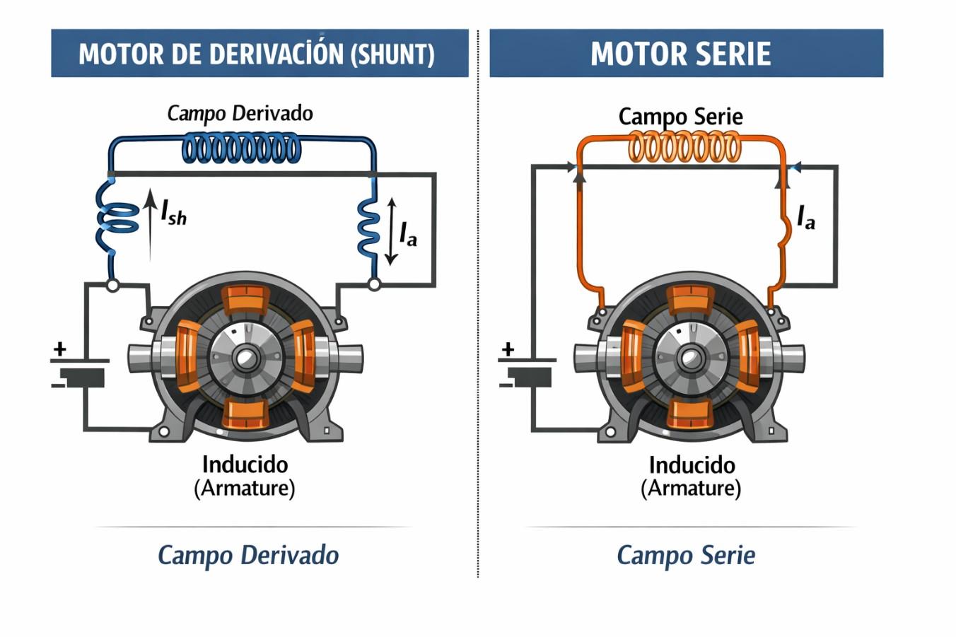 En motores de derivación, el flujo permanece prácticamente constante, por lo que el torque es proporcional únicamente a la corriente del inducido. En motores serie, el flujo también depende de la corriente, generando un par mucho mayor a bajas velocidades.
