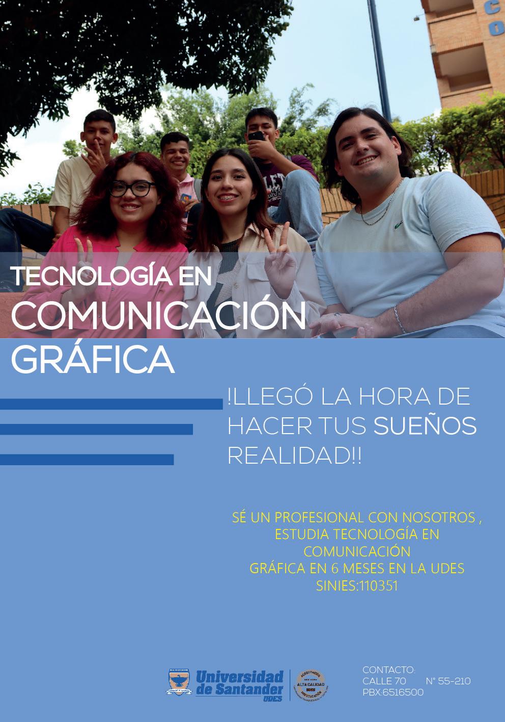 La Universidad de Santander UDES en el año 2020 a través del Centro de Formación en Tecnología y bajo la coordinación del Diseñador Gráfico Héctor Fernando Carrillo Márquez y su equipo de trabajo decidió crear un programa conectado con la creatividad, comunicación, fotografía, ilustración, piezas gráficas, entre otras ramas de las artes gráficas y publicidad, cumpliendo así con la región y el país en profesionales de esta área del conocimiento requeridos por el campo laboral. El programa se denomina Tecnología en Comunicación Gráfica ofreciendo en el la unión lo mejor de la comunicación, marketing, publicidad y el diseño gráfico.