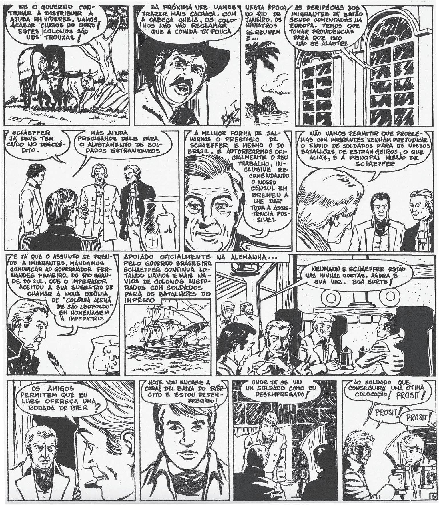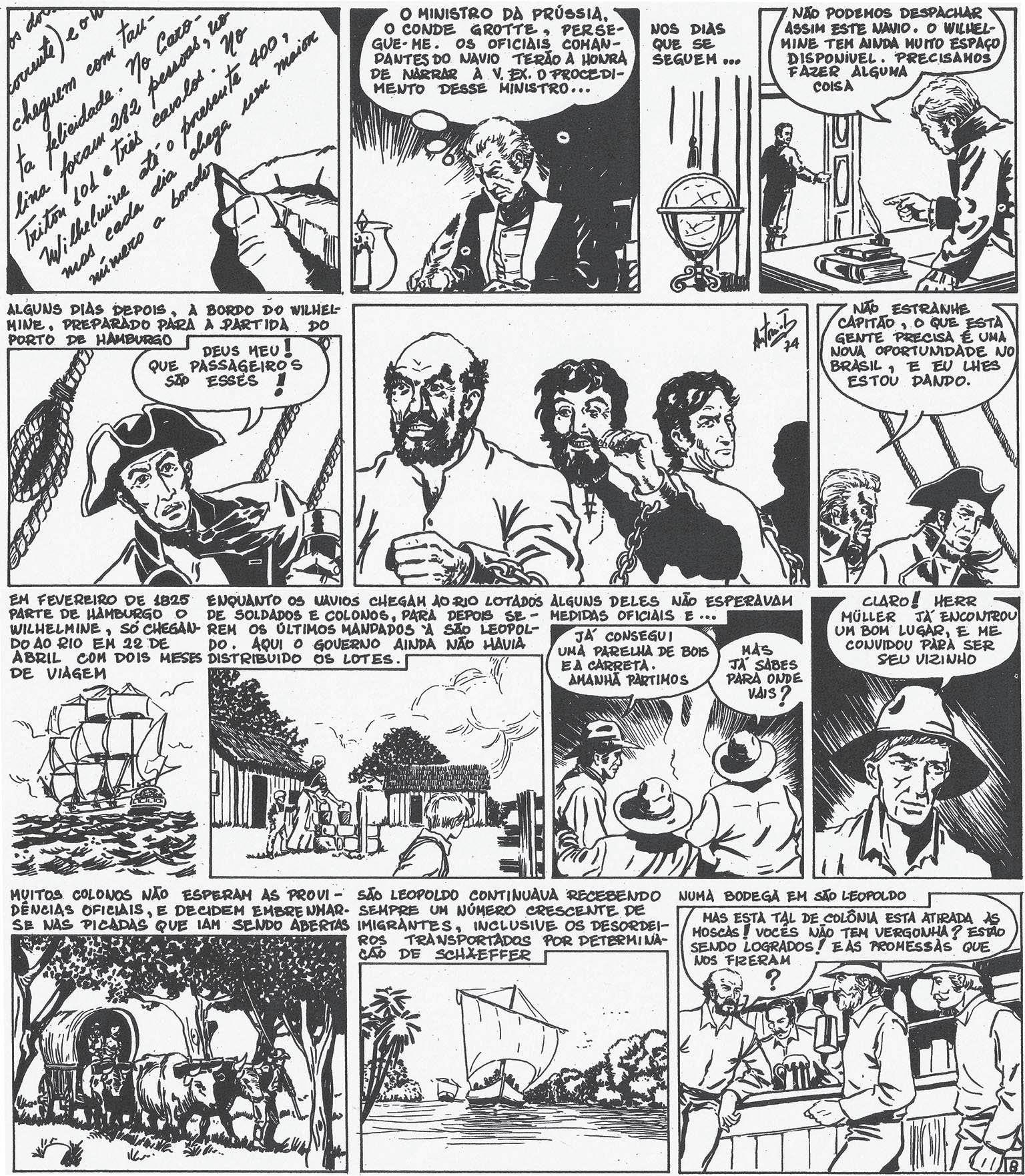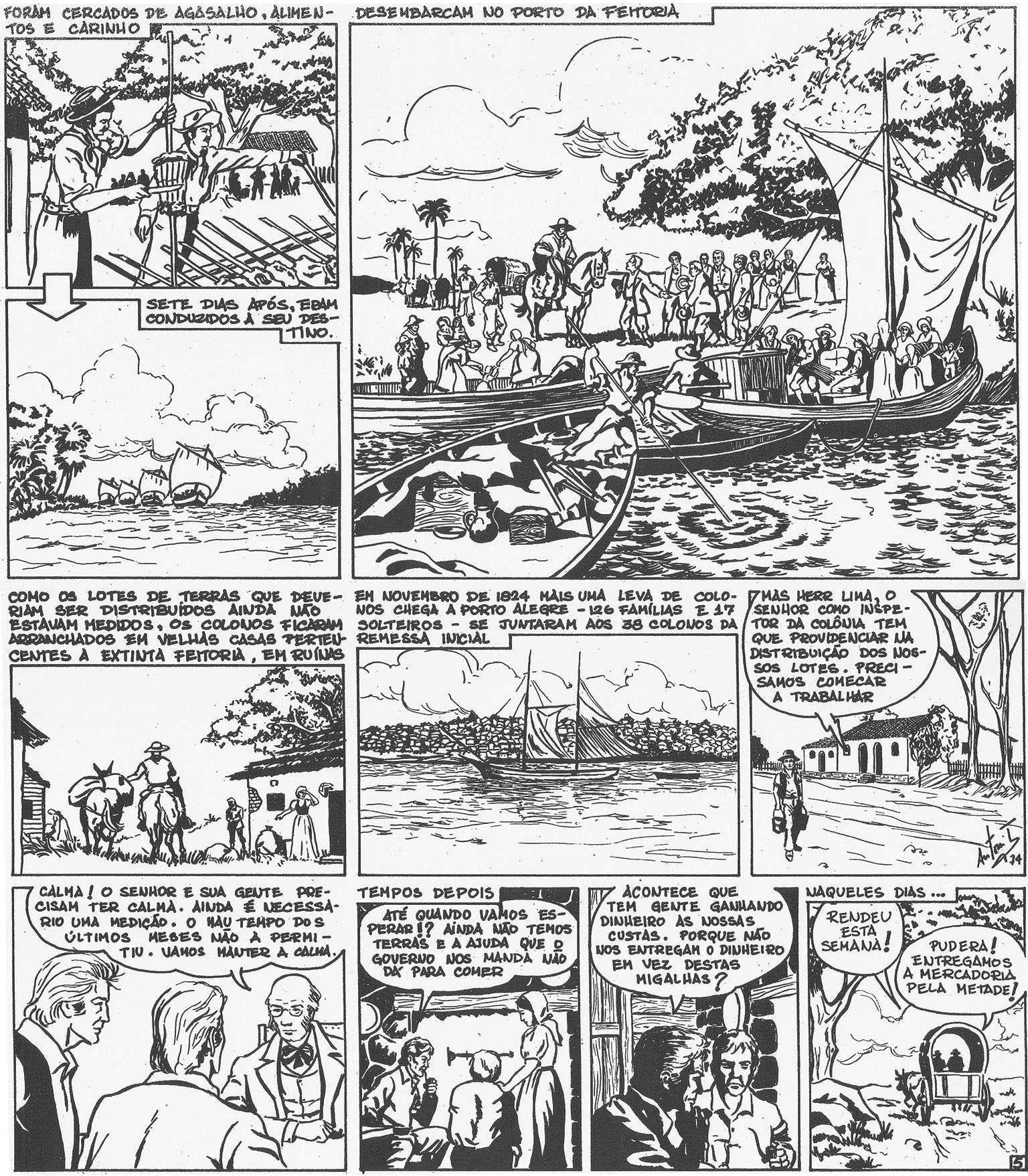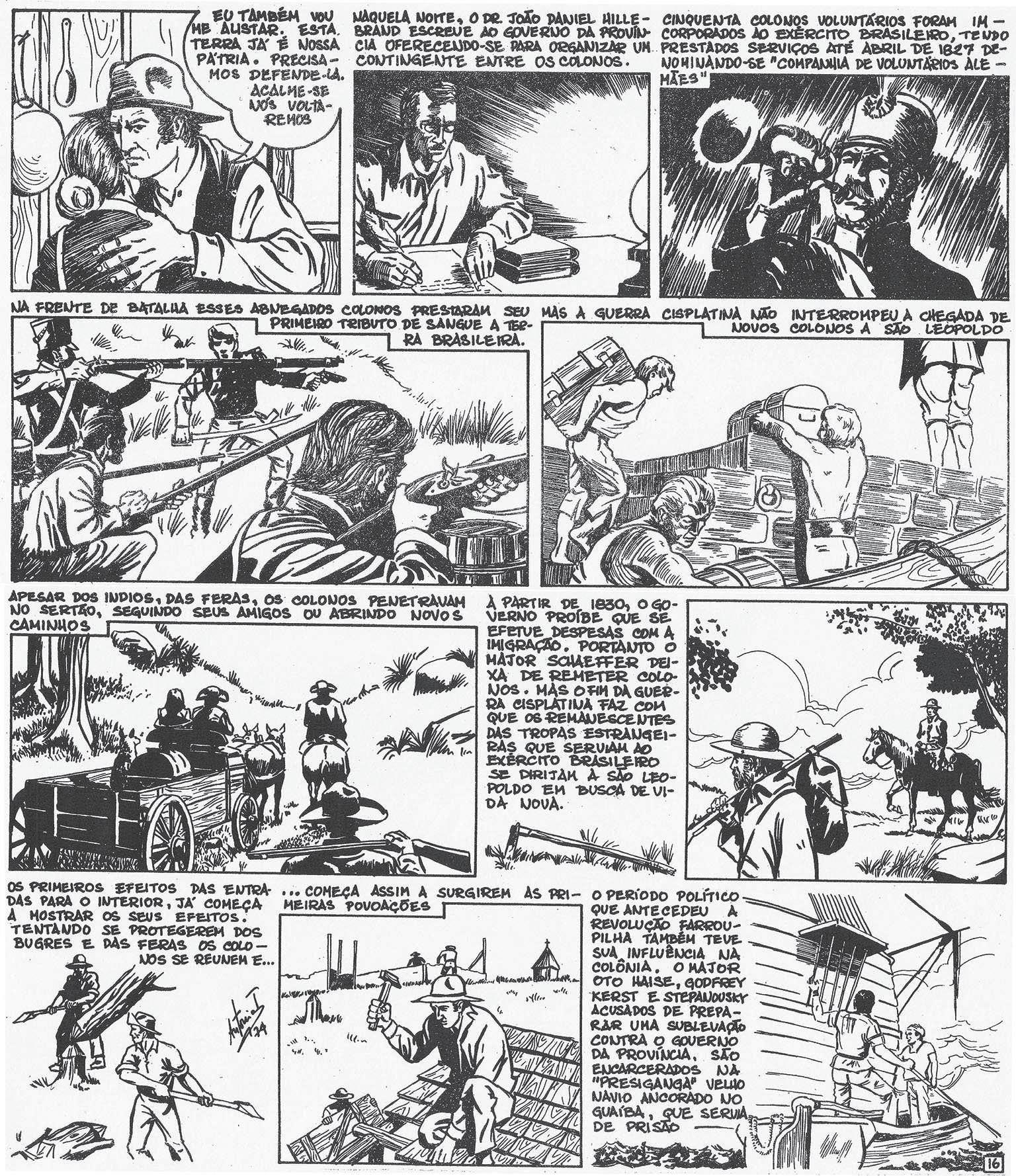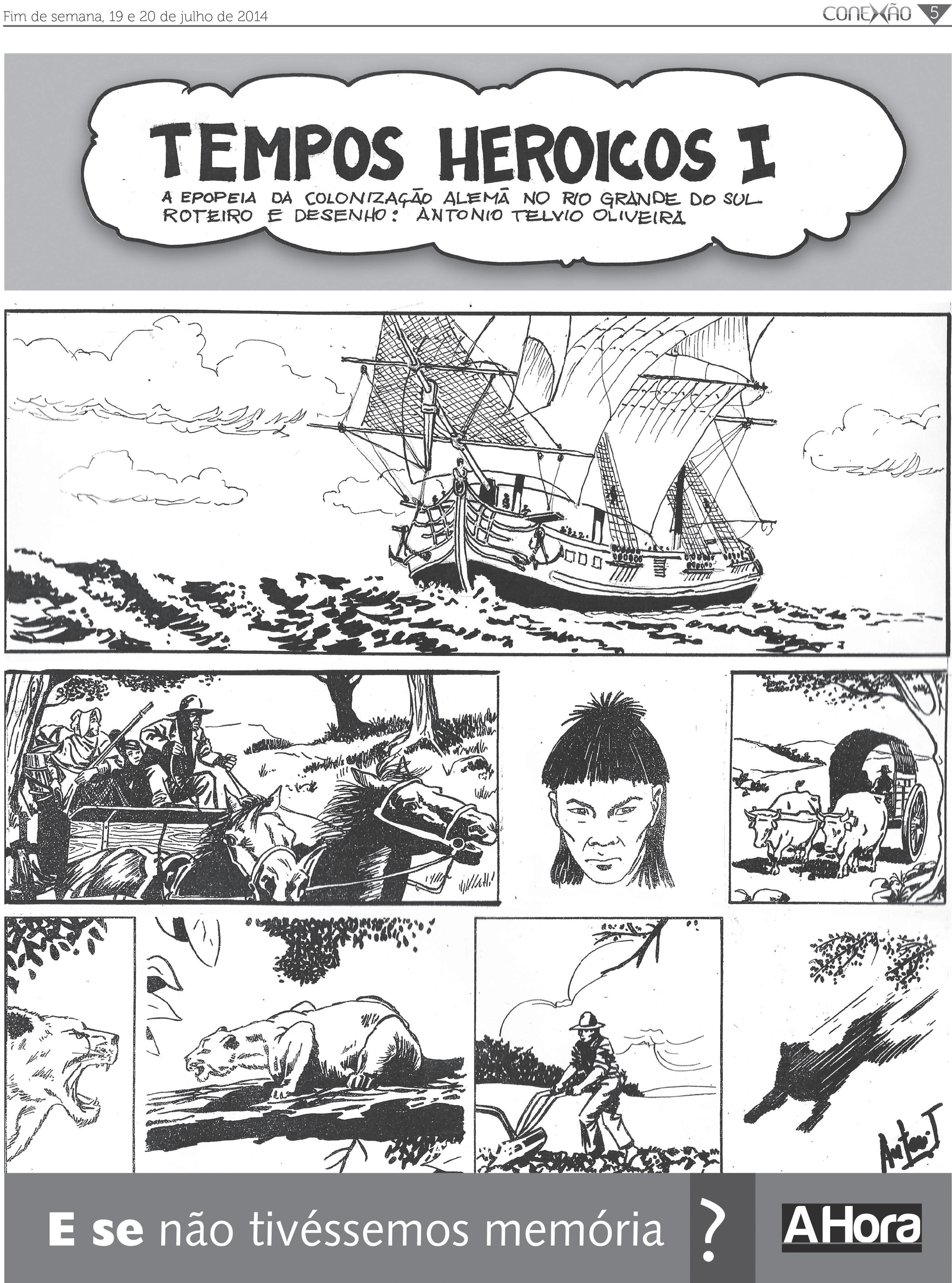 Desenhista conta história da colonização alemã no estado em série sobre os 192 anos de imigração. Diálogos de personagens reais esclarecem com detalhes a epopeia germânica, remetendo o leitor a uma sequência cinematográfica.