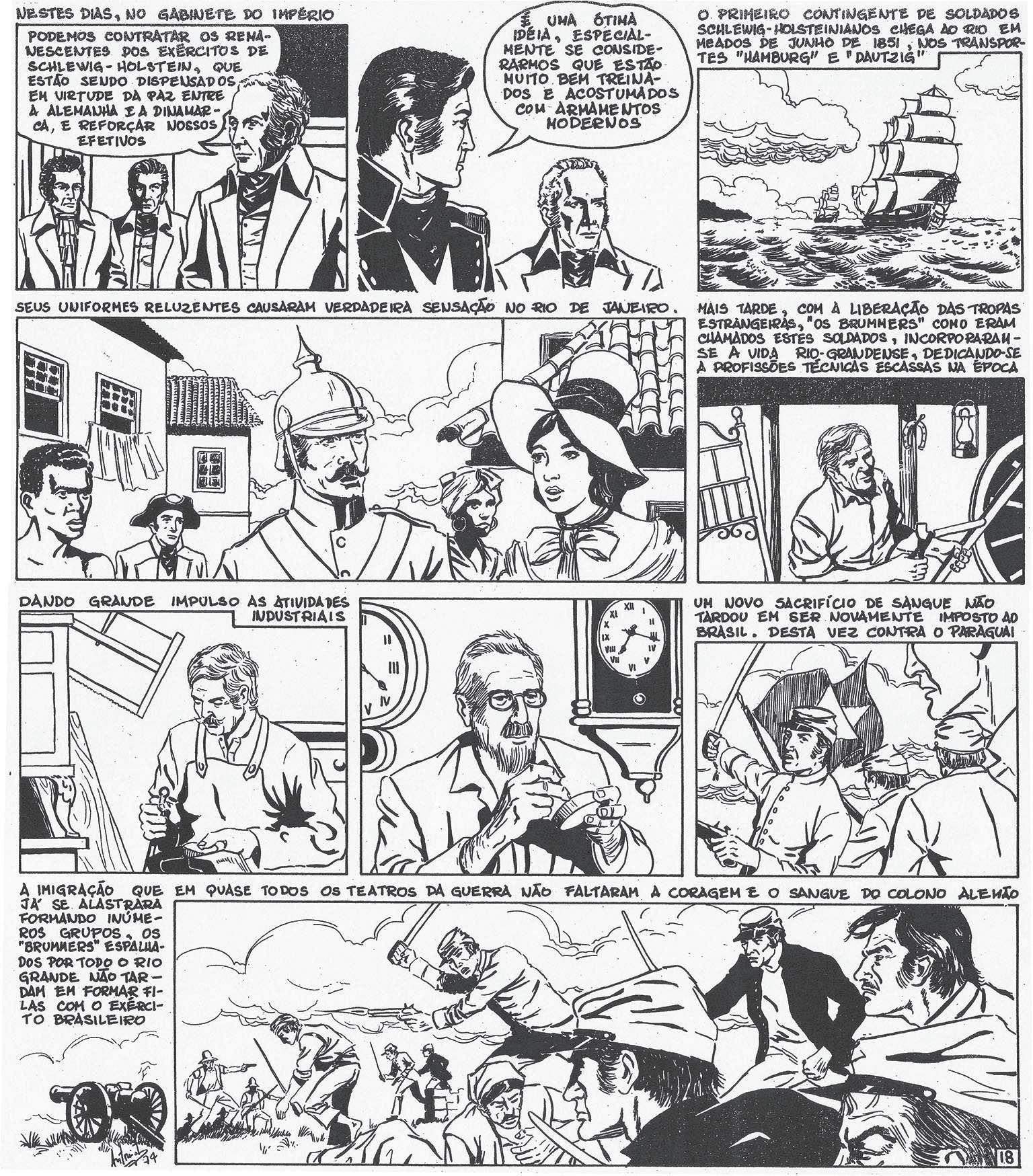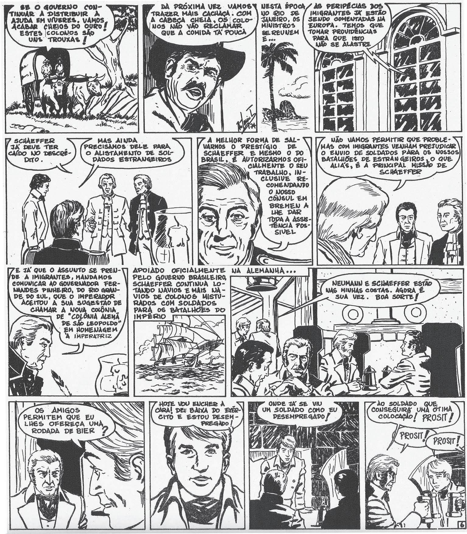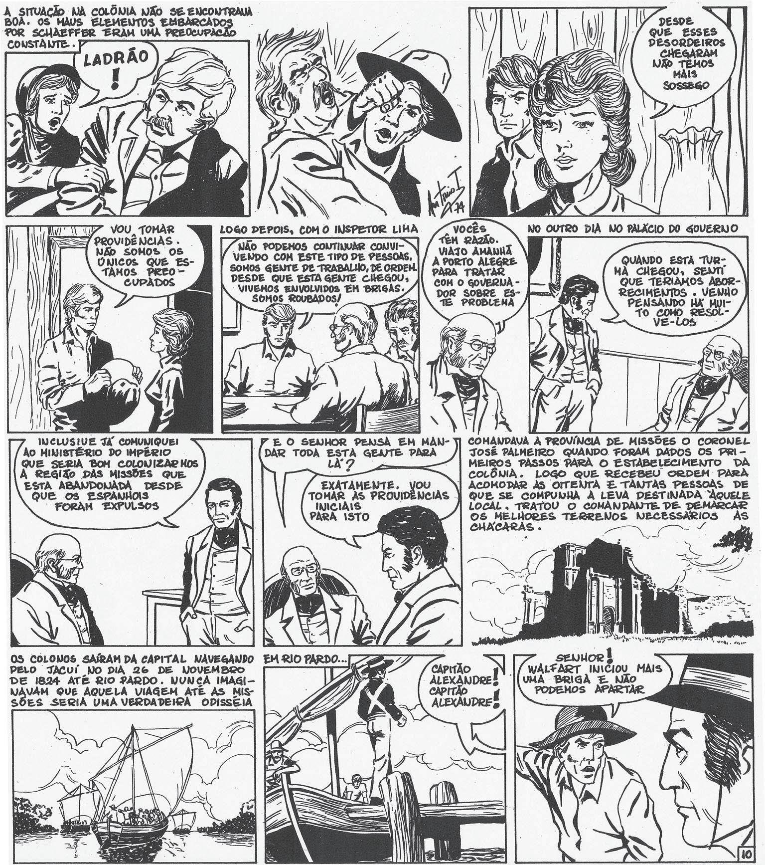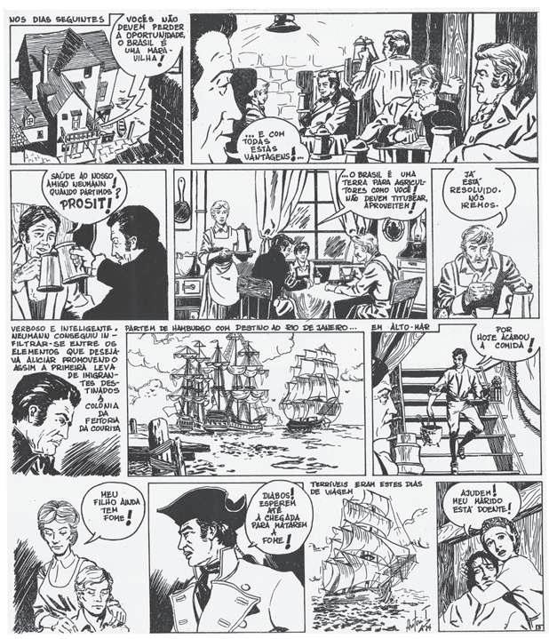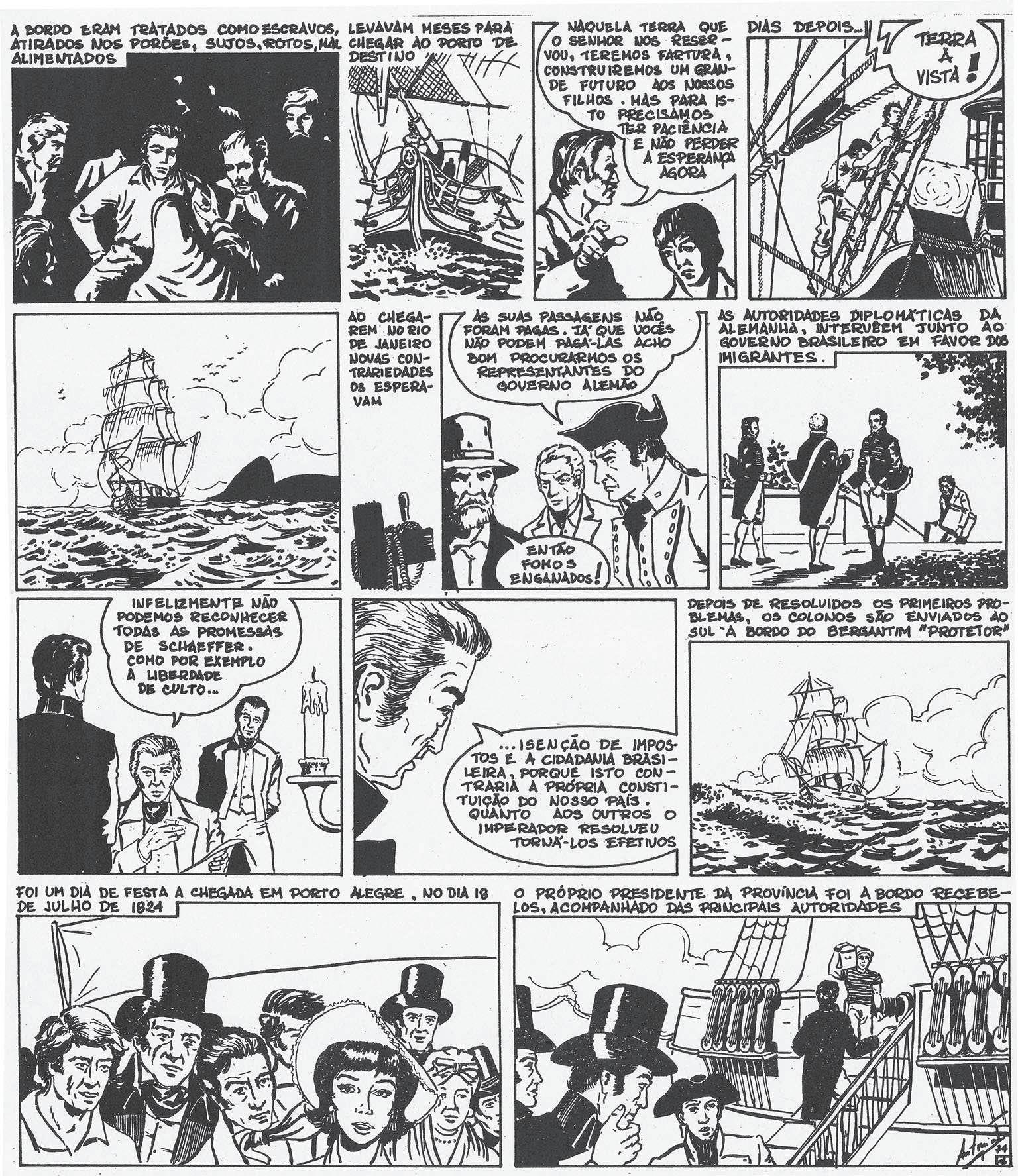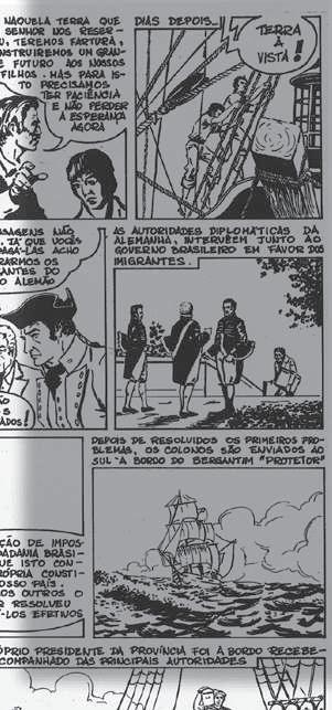 Desenhista conta história da colonização alemã no estado em série sobre os 192 anos de imigração. Diálogos de personagens reais esclarecem com detalhes a epopeia germânica, remetendo o leitor a uma sequência cinematográfica.