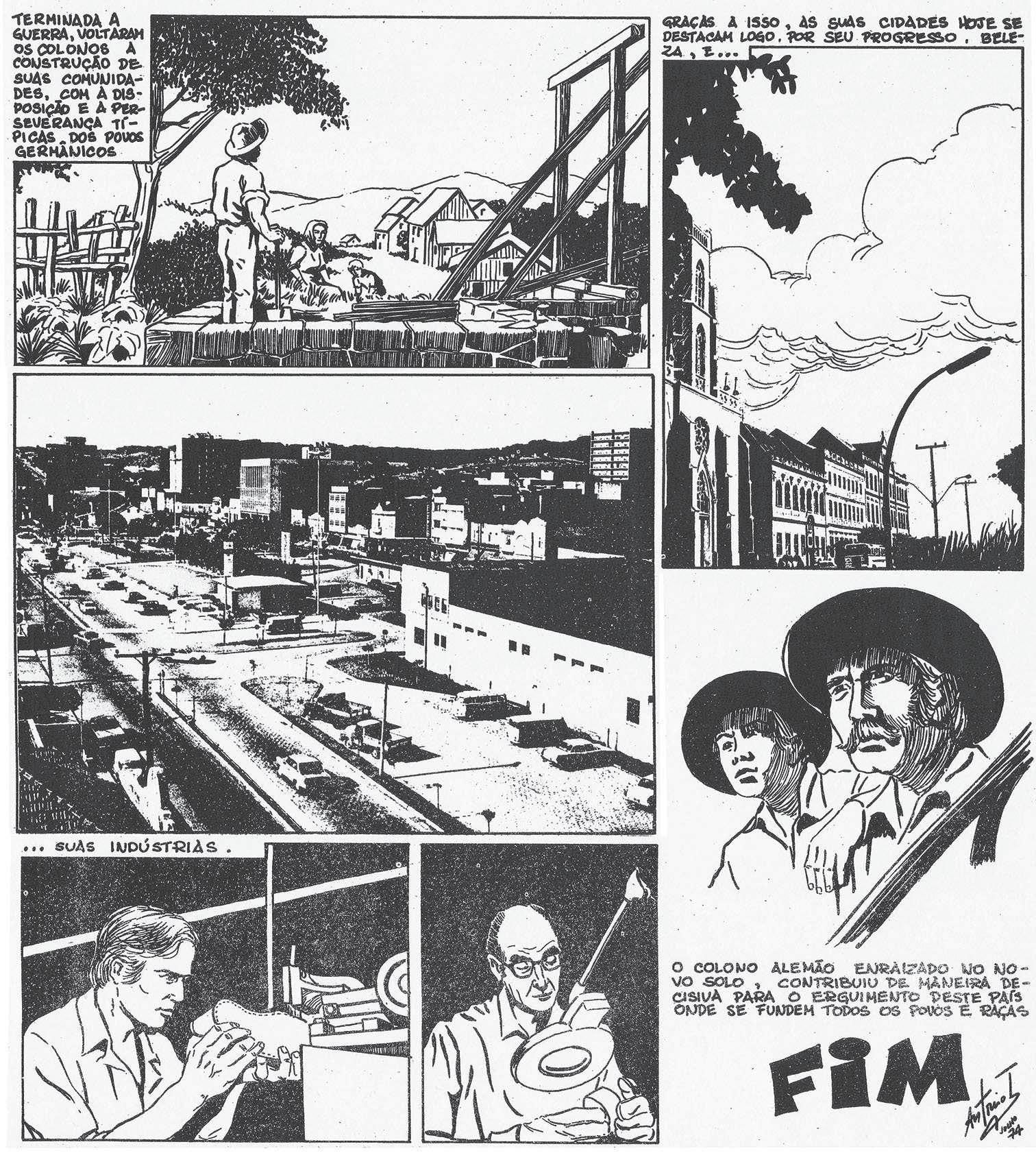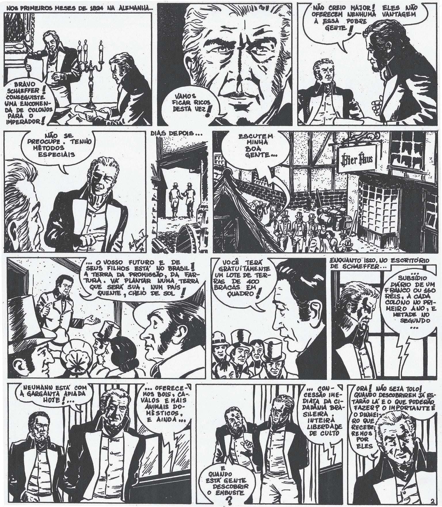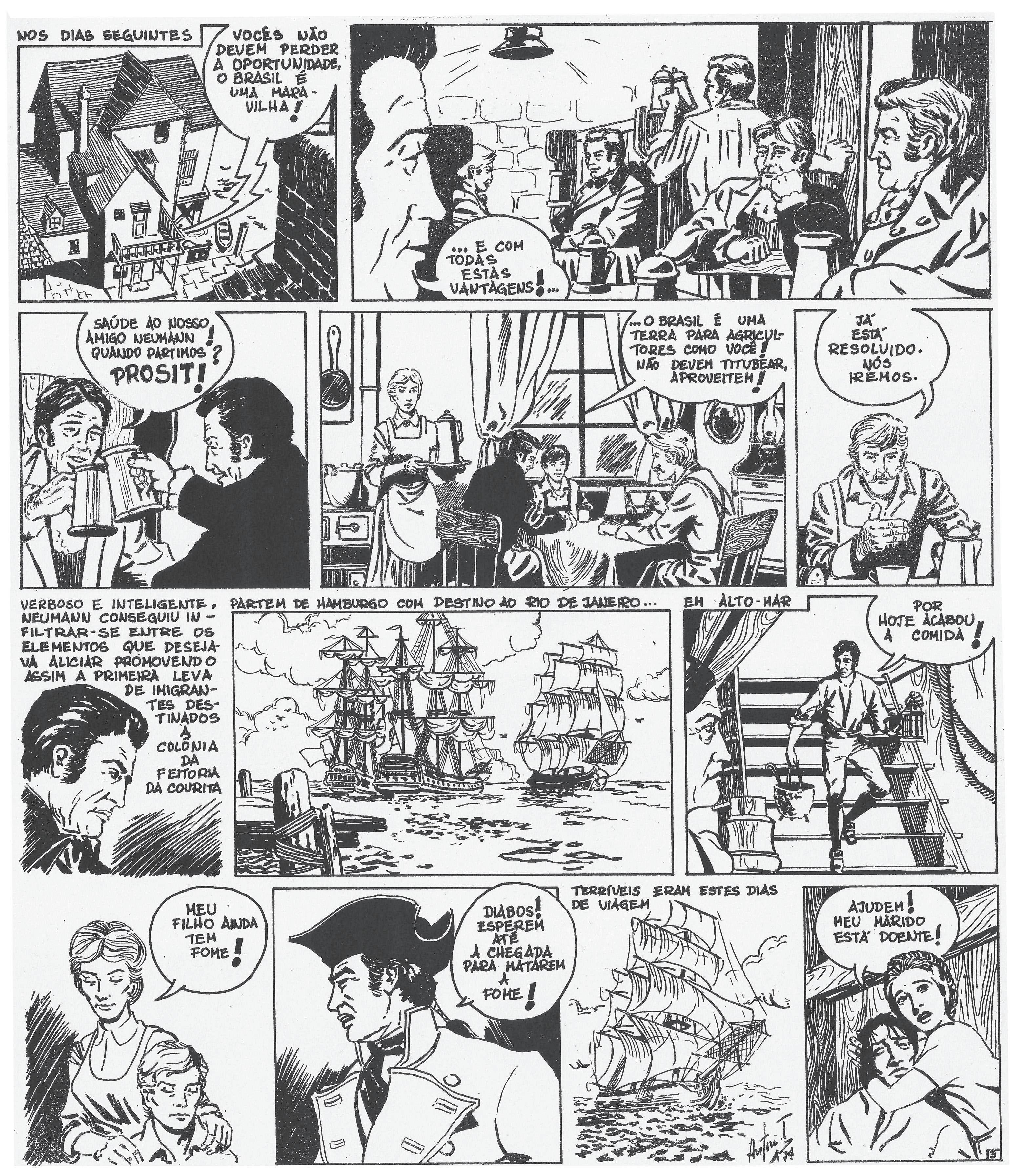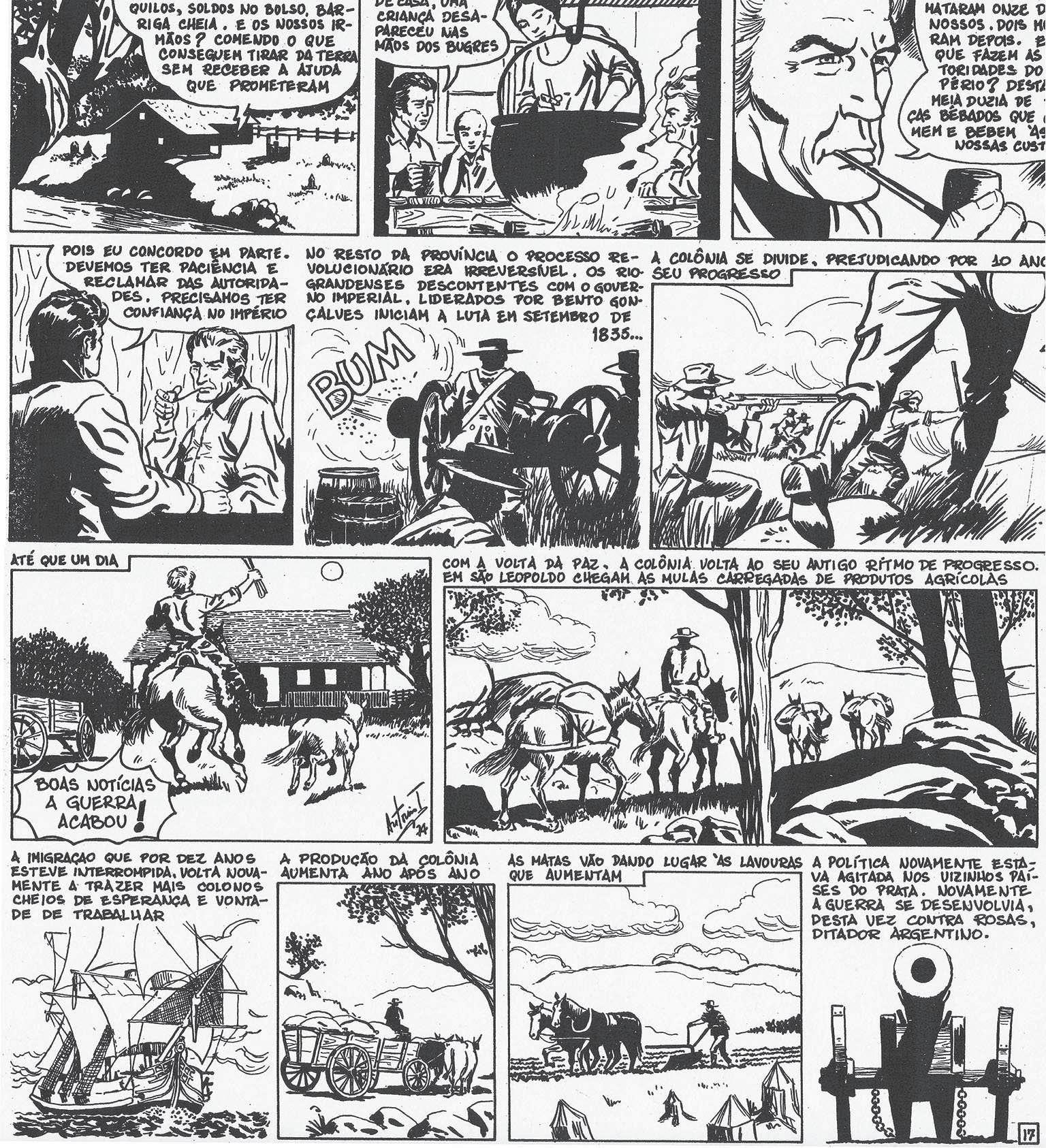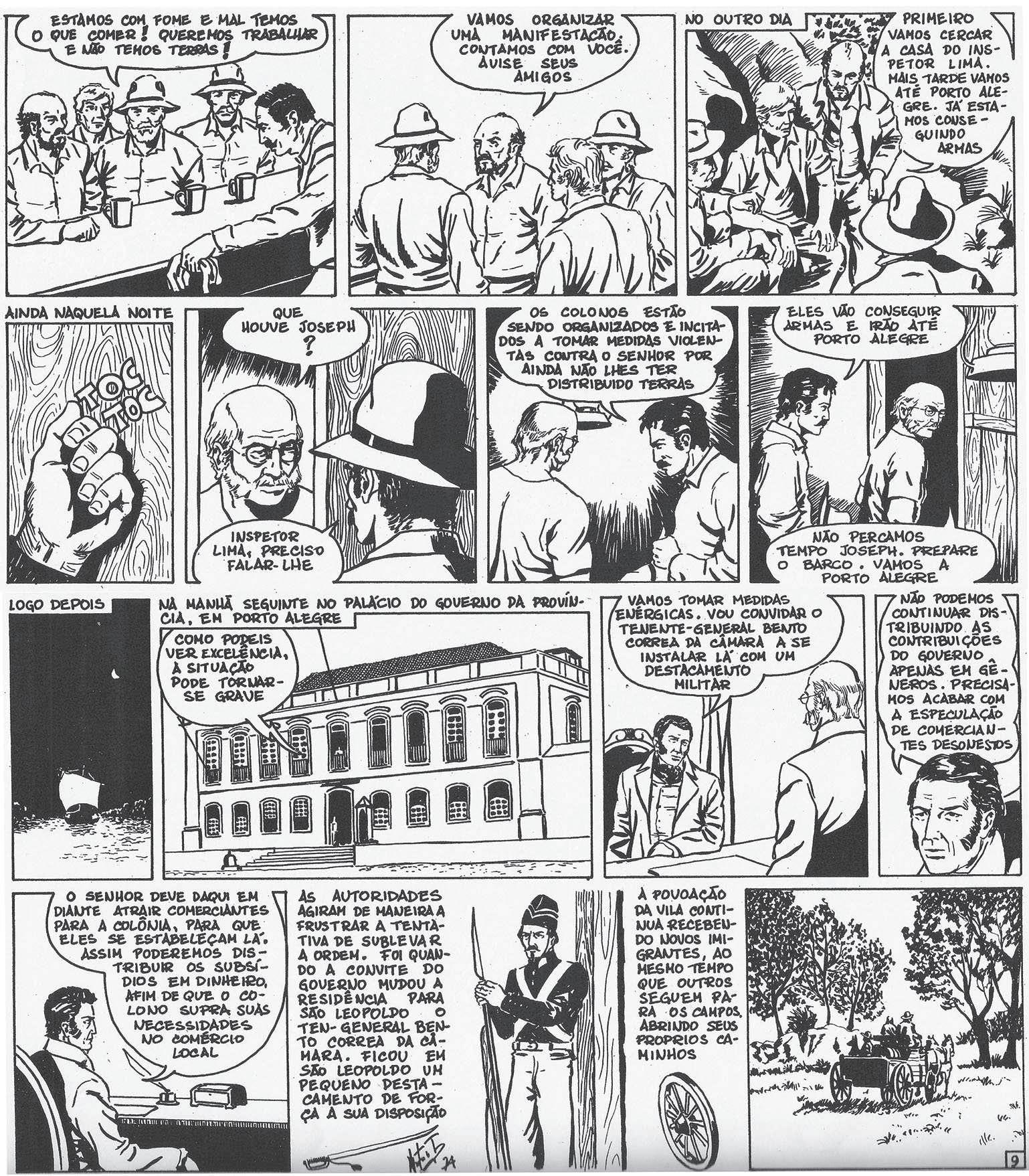 Desenhista conta história da colonização alemã no estado em série sobre os 192 anos de imigração. Diálogos de personagens reais esclarecem com detalhes a epopeia germânica, remetendo o leitor a uma sequência cinematográfica.
