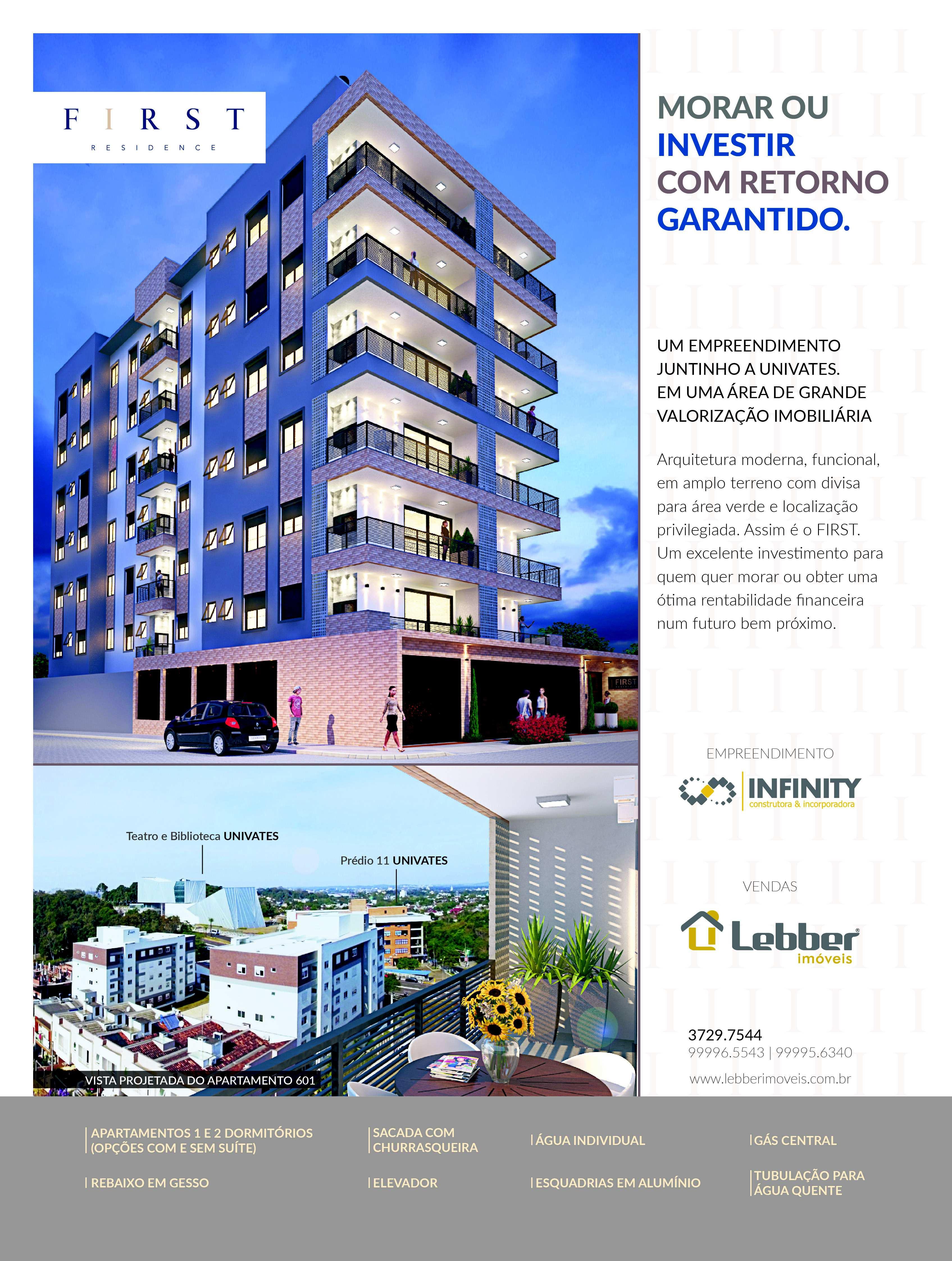 Em construção nas proximidades do câmpus da Univates, o First Residence é o lançamento da Lebber no bairro Universitário. O edifício já está disponível para vendas e tem apartamentos de um e dois quartos em sete pavimentos, totalizando 30 unidades.