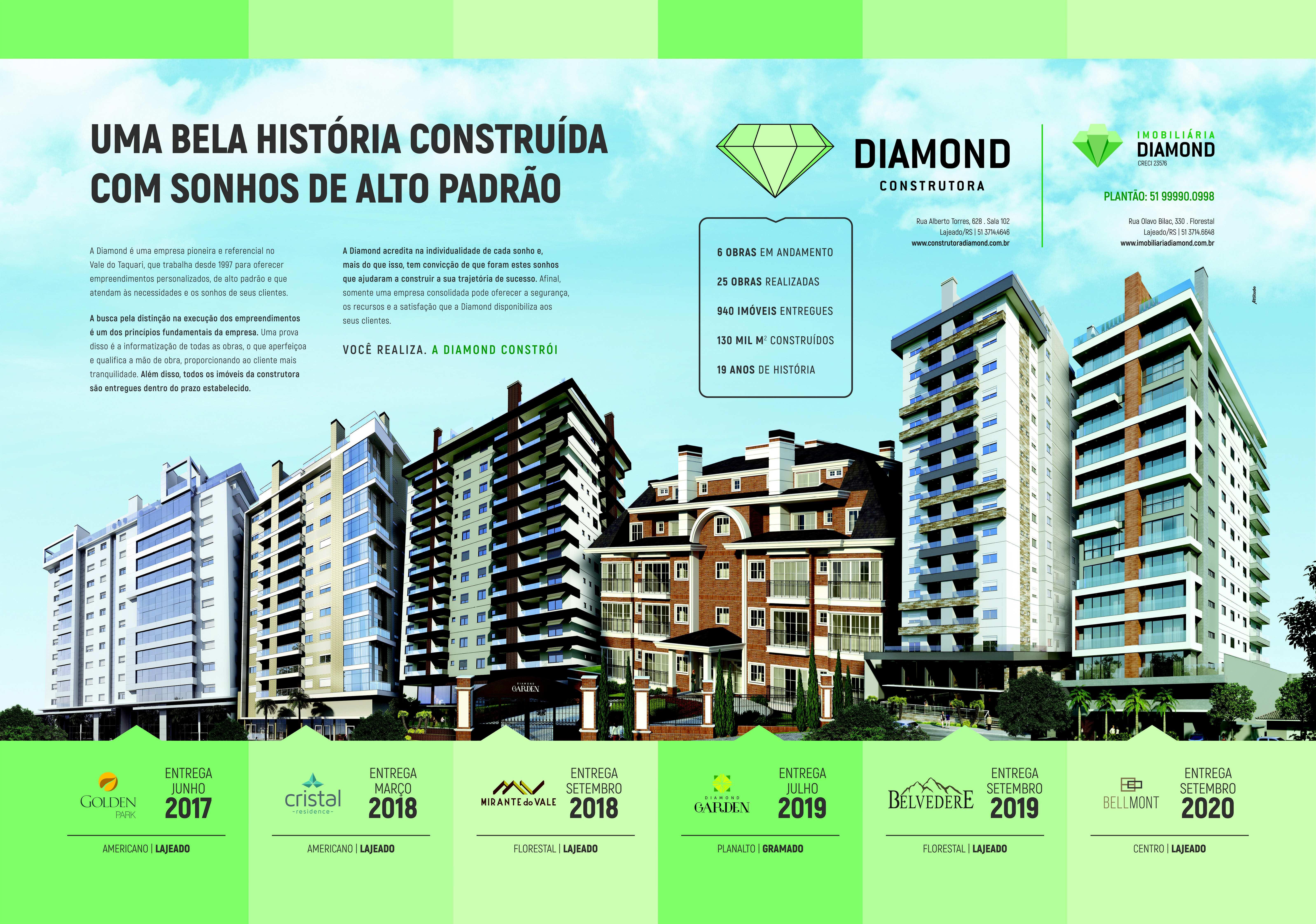 nho Marinho, no centro. Serão unidades de três dormitórios e três suítes, com previsão de término da obra de três anos. Para diversificar os negócios, a Diamond também investe em empreendimentos em Gramado. O condomínio Diamond Garden inclui dois prédios, com apartamentos de dois dormitórios e
