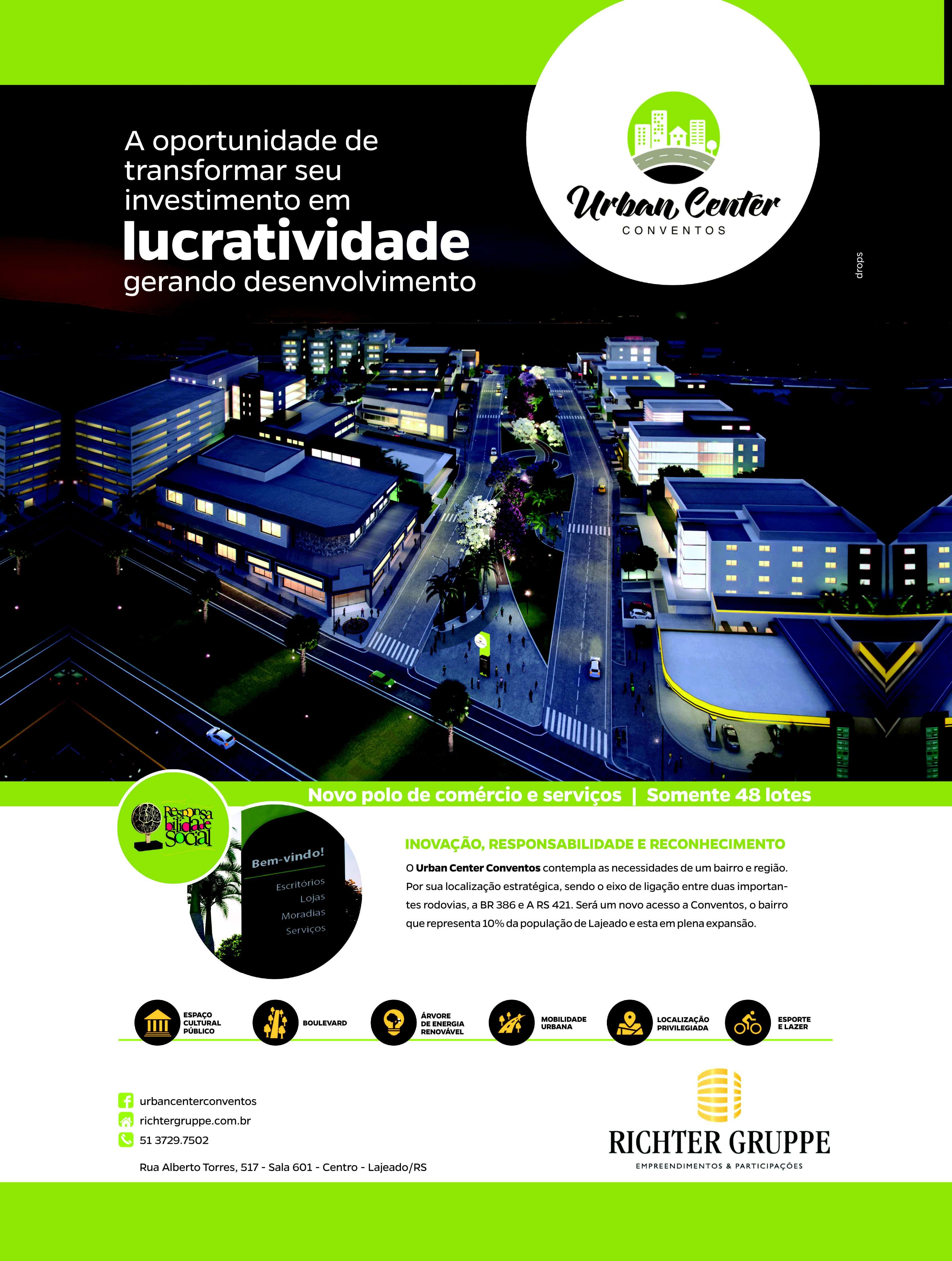A Construtora Richter Gruppe aposta em um novo conceito de empreendimento capaz de acelerar o desenvolvimento do bairro Conventos. Próximo de ser concluído, o Urban Center é um loteamento aberto, com áreas de uso comunitário e a união de conceitos de