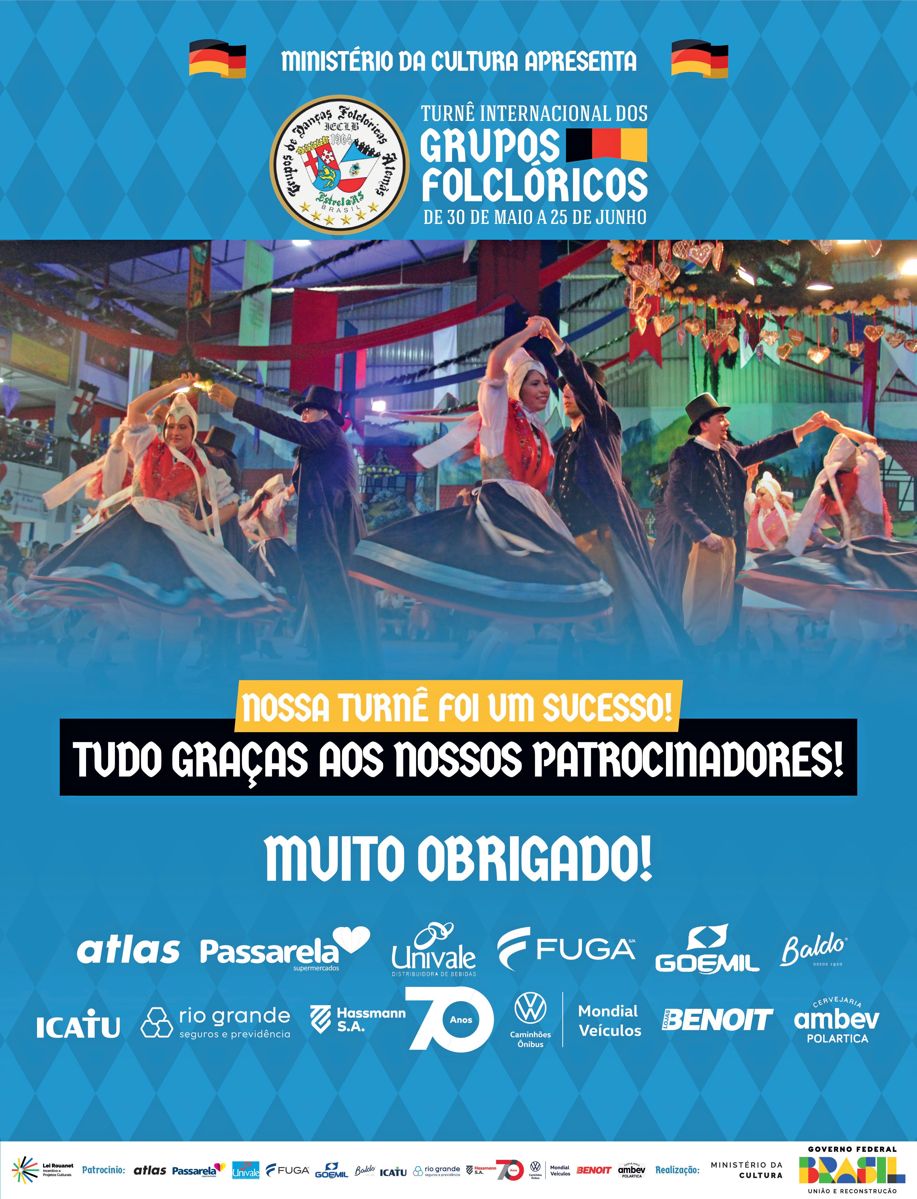 Opúblico animado, receptivo e caloroso marcou cada apresentação dos Grupos Folclóricos de Estrela durante a 7ª Turnê Internacional pela Europa. O espetáculo levou ao Velho Continente diferentes aspectos da cultura brasileira. Com coreografias que retrataram o tradicionalismo gaúcho, as danças folclóricas presentes na região do Vale do Taquari, o forró, o samba e o Carnaval, os dançarinos e os músicos animaram cidades da Alemanha, Áustria e Eslovênia.