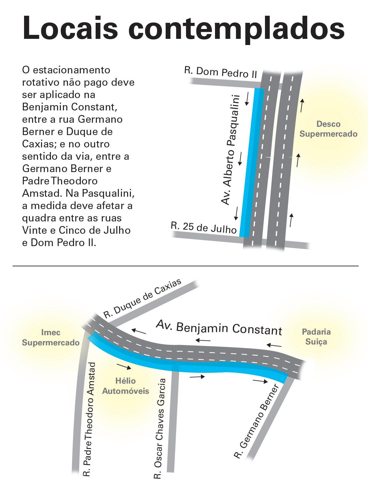 A reclamação de comerciantes quanto à falta de vagas para estacionar na área central resulta na tentativa de implantar um modelo de rotativo gratuito em dois trechos. Departamento de Trânsito pretende começar a experiência nas próximas semanas. Proposta será avaliada pelo Conselho de Trânsito na quarta-feira. De acordo com o coordenador do departamento, Carlos Kayser, serão instaladas placas que determinem tempo máximo de 15 ou 30 minutos de estacionamento