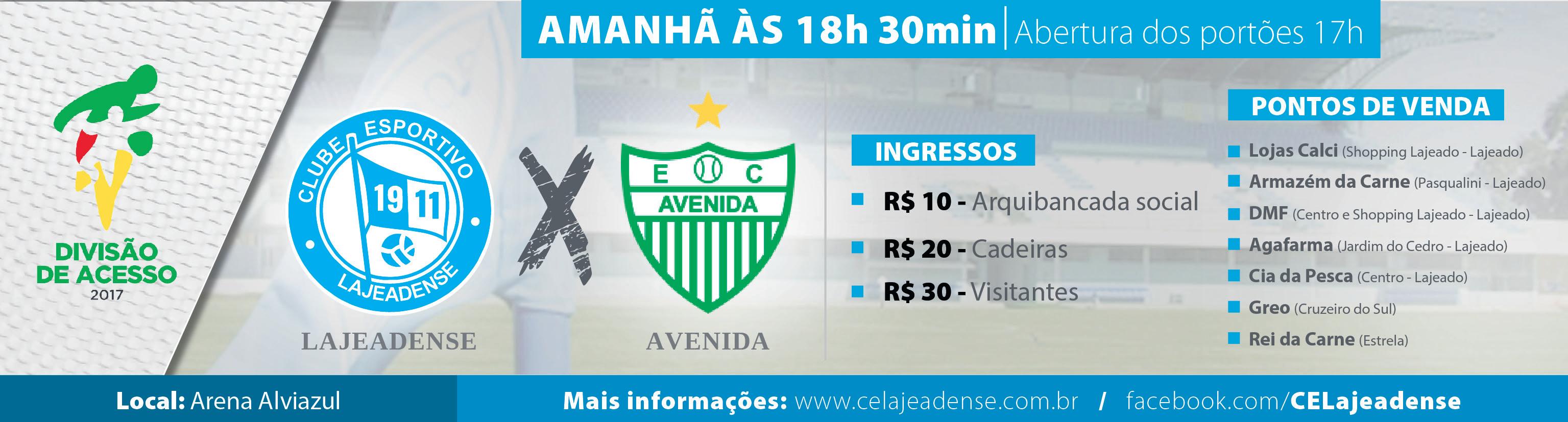 O Lajeadense está a dois passos de retornar à elite do futebol gaúcho. Amanhã, a partir das 18h30min, enfrenta o Avenida pela partida de ida das semifinais da Divisão de Acesso. Em os ingressos estão à venda nas Lojas Calci, Arma zém da Carne, DMF Esportes e Farmácia Agafar ma, no bairro Jardim do Cedro. Em Cruzeiro do Sul, os torcedores podem comprá-los no Restau rante do Greu. E em Estrela, no Rei da Carne.
